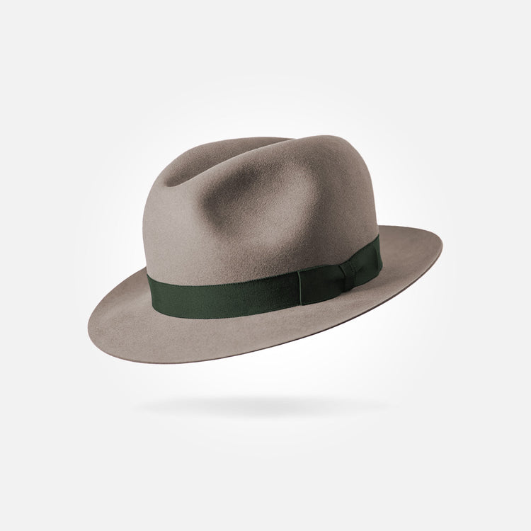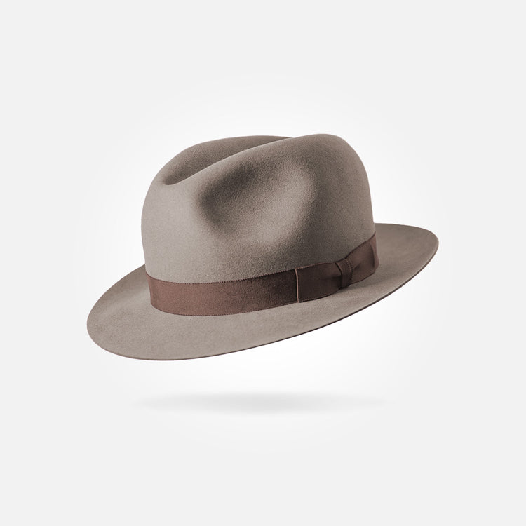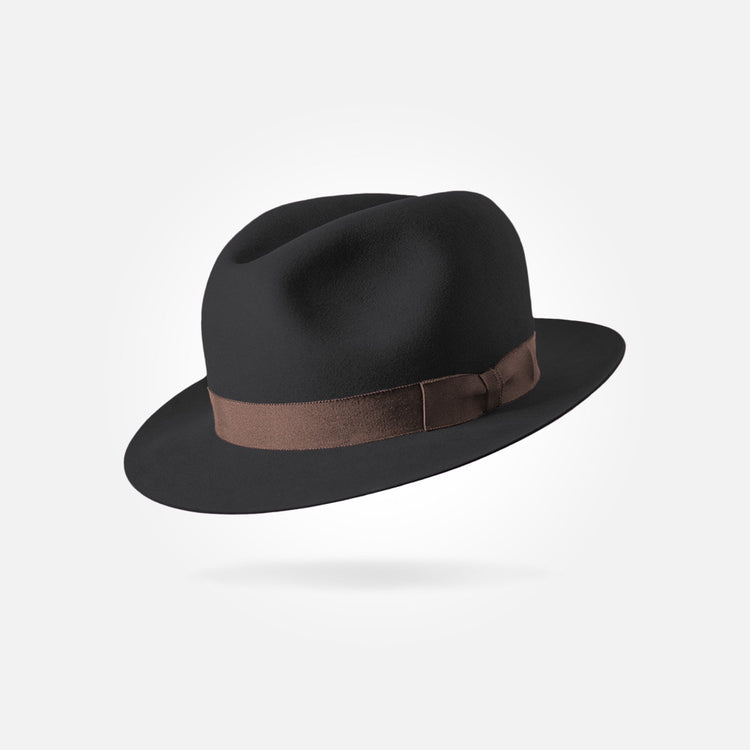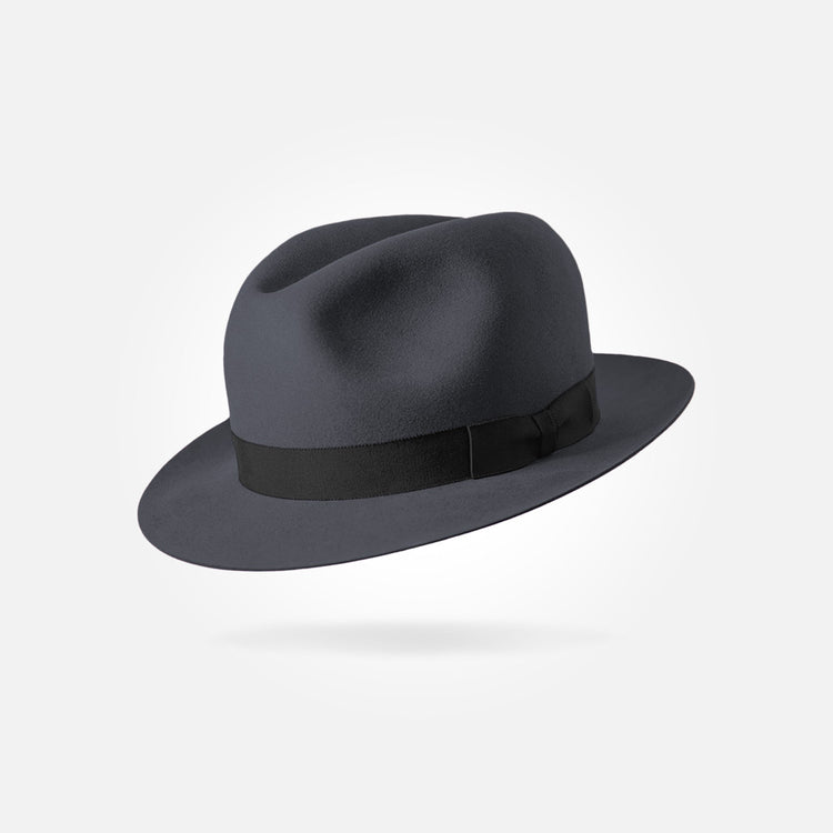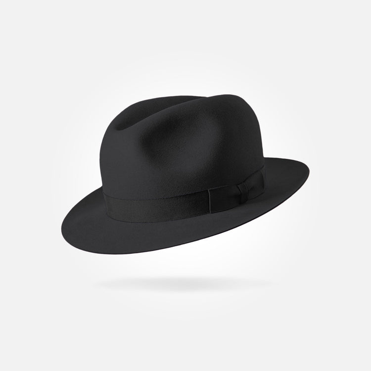 This is a medium height centre dent fedora with a 5.5 cm / 2.17 in snap brim.It features a 25 mm modern grosgrain hatband with a classic bow.