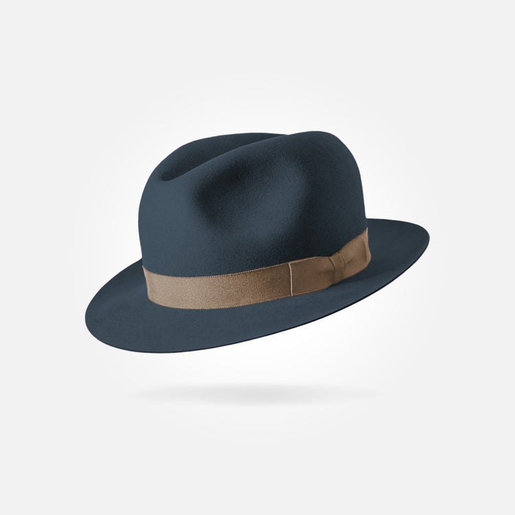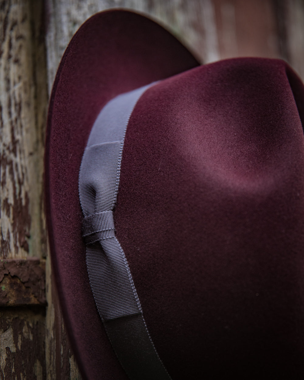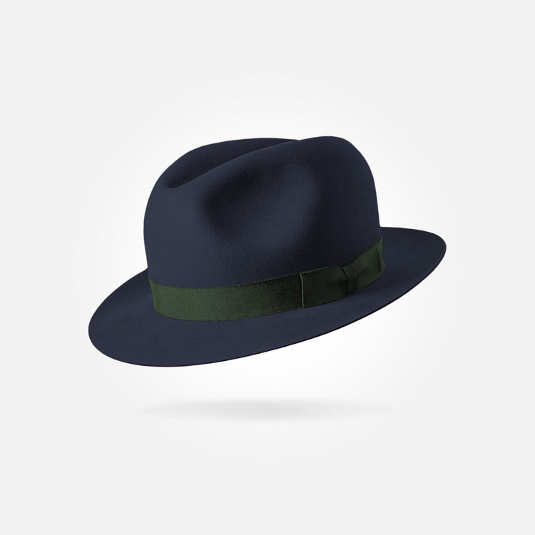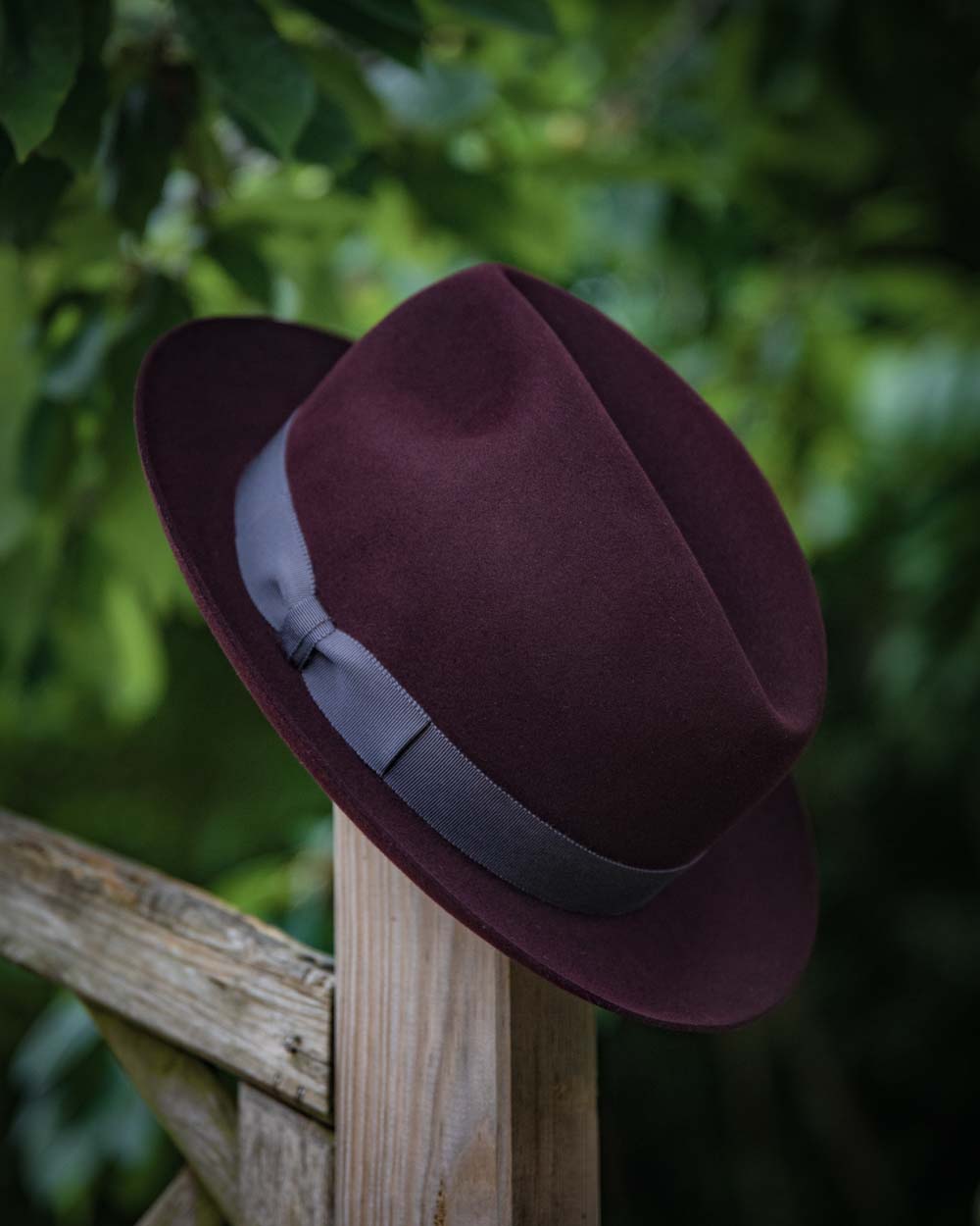 This is a medium height centre dent fedora with a 5.5 cm / 2.17 in snap brim.It features a 25 mm modern grosgrain hatband with a classic bow.