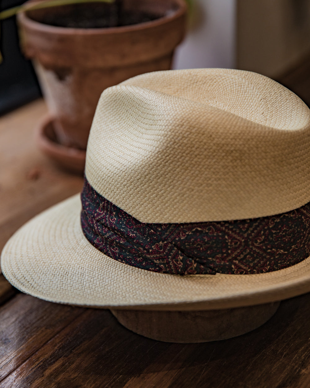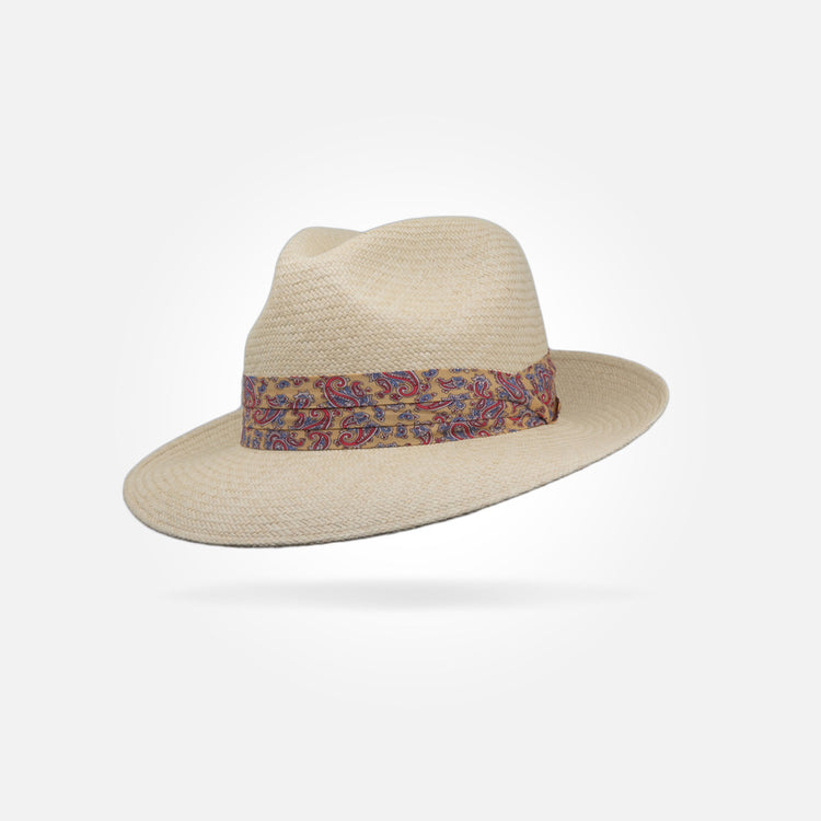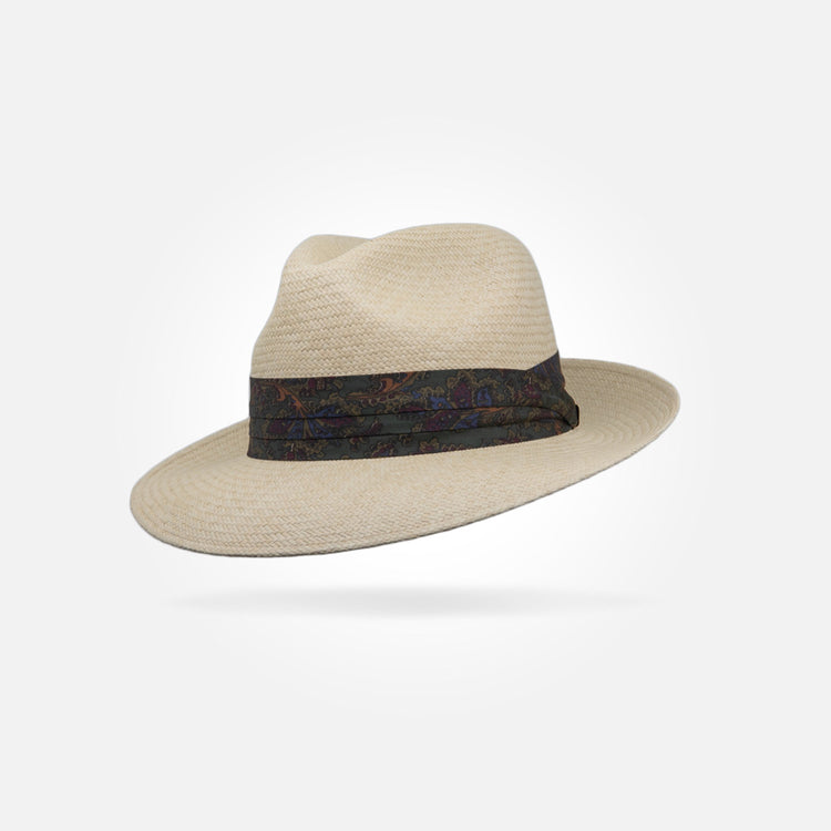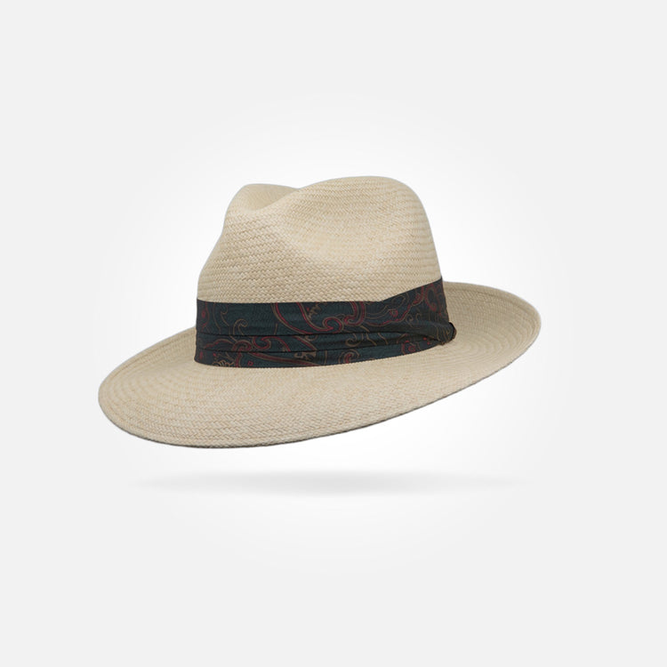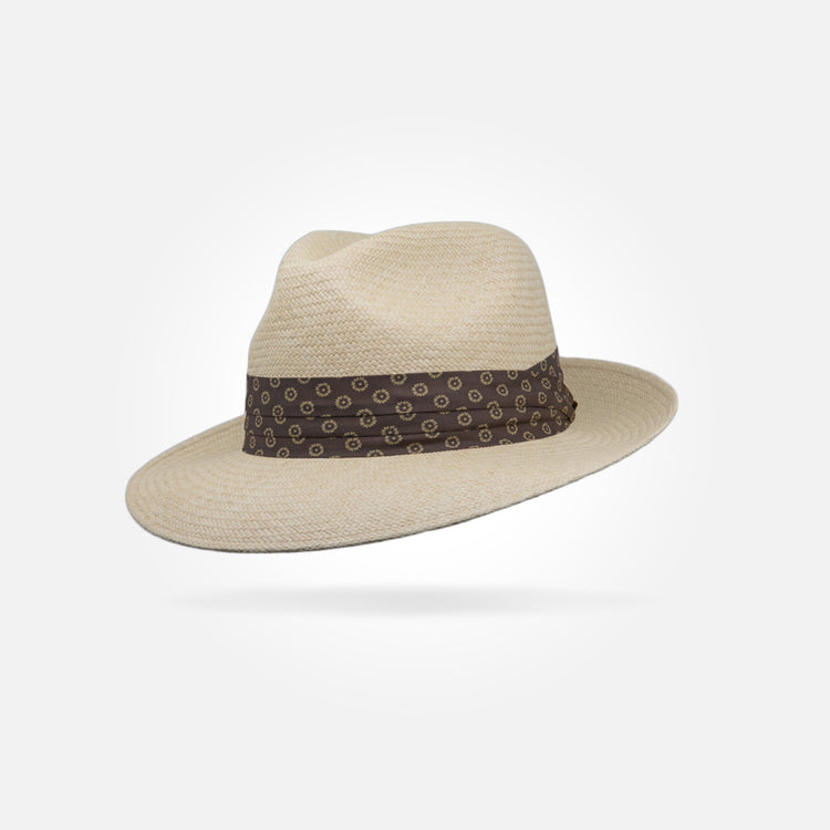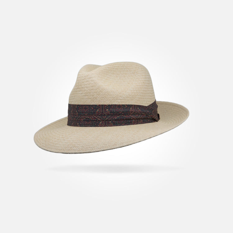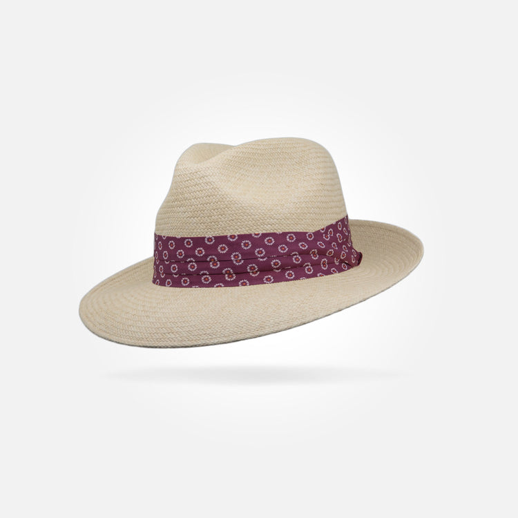 This is a medium height centre dent panama with a 7 cm / 2.75 in - 8 cm / 3.15 in brim. It features a 38 mm puggaree hatband.