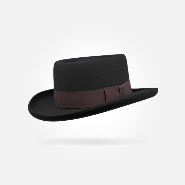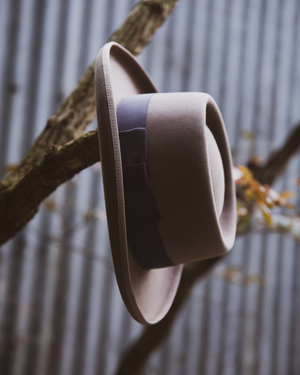 This is a tall height telescope crown with a 7 cm / 2.75 in bound pencil roll brim. It features a 38 mm modern grosgrain hatband with a open double back bow.