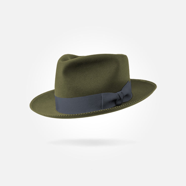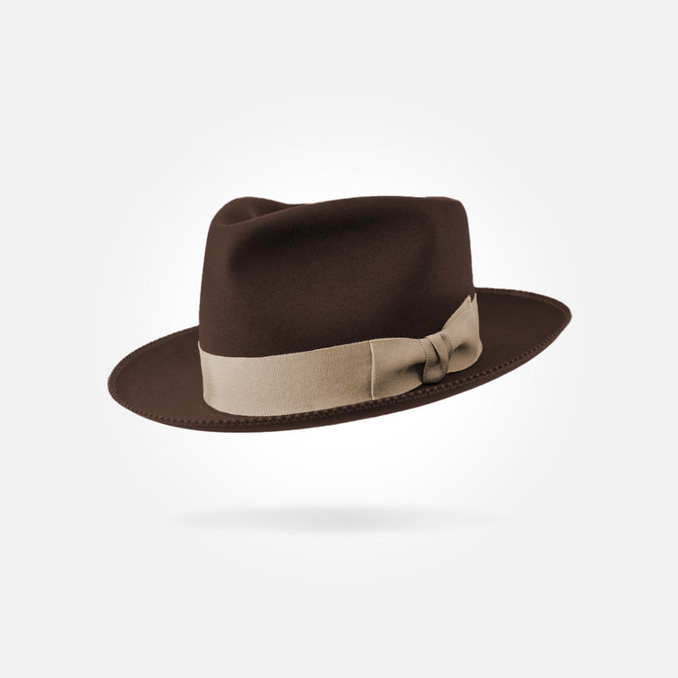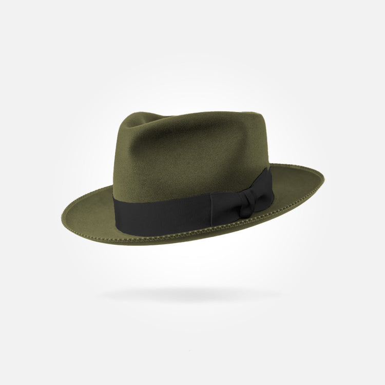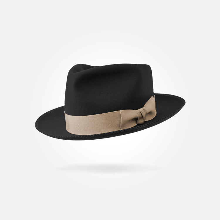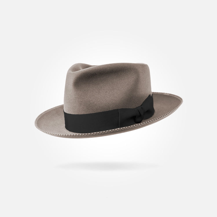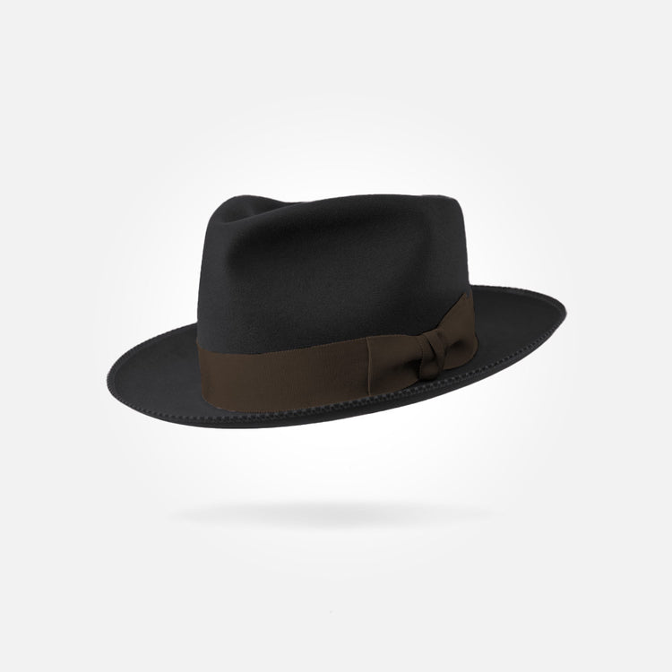 This is a tall classic diamond fedora with a 6.5 cm / 2.55 in whipstitch snap brim. It features a 38 mm modern grosgrain hatband with a frayed double back bow with a twisted bowkeeper.