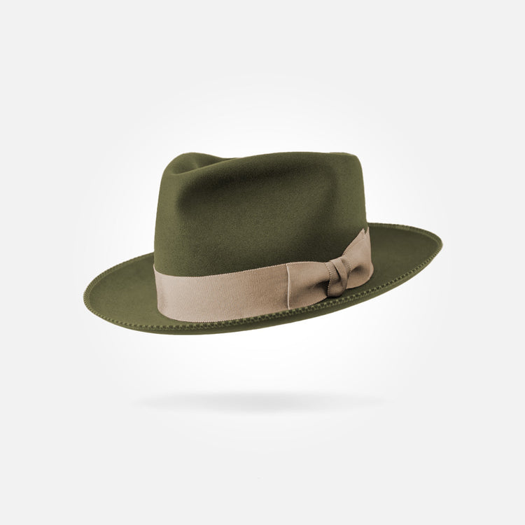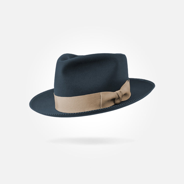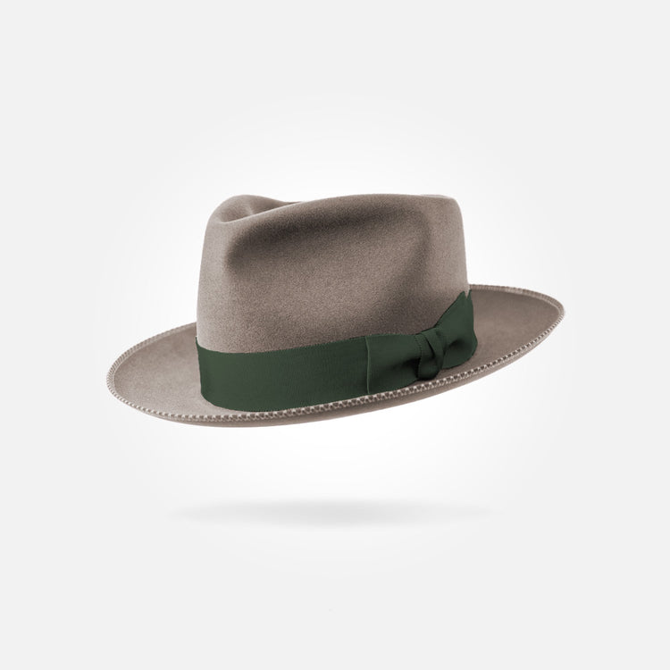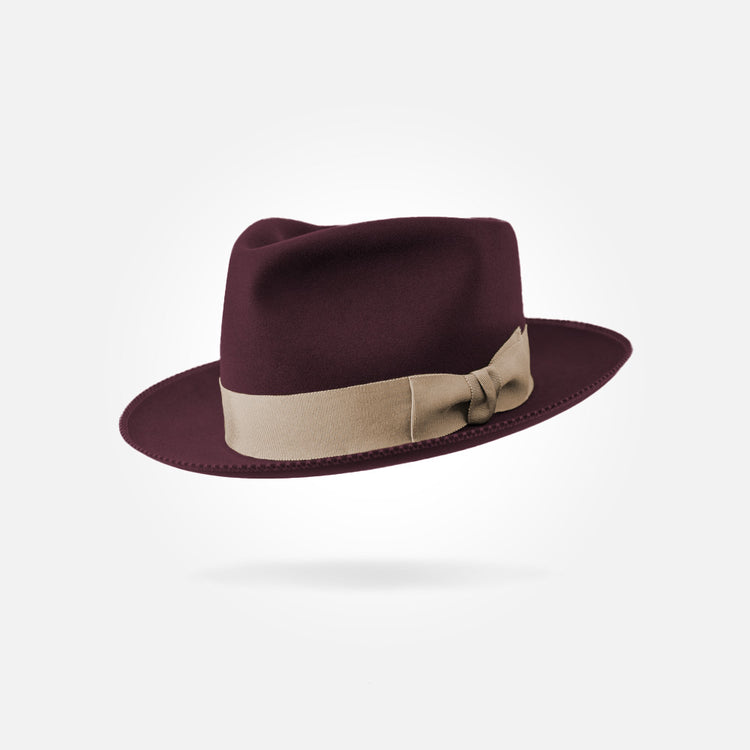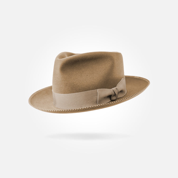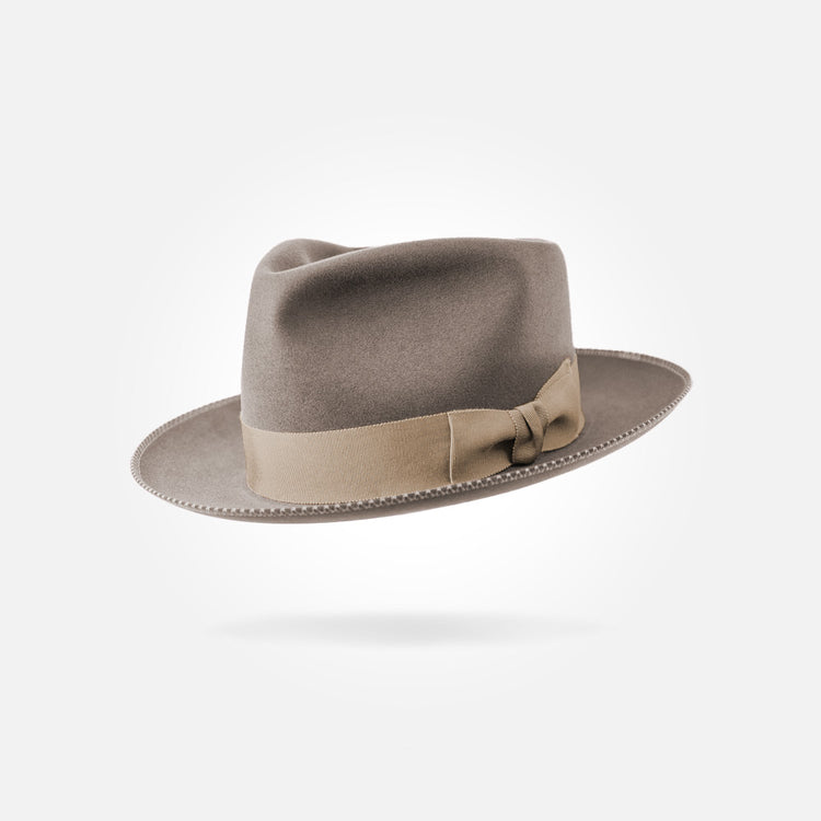 This is a tall classic diamond fedora with a 6.5 cm / 2.55 in whipstitch snap brim. It features a 38 mm modern grosgrain hatband with a frayed double back bow with a twisted bowkeeper.