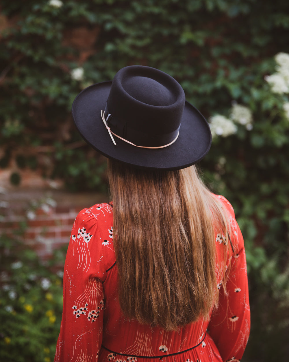 It features a 38 mm modern grosgrain hatband with a double back bow, fabric details & a leather cord.