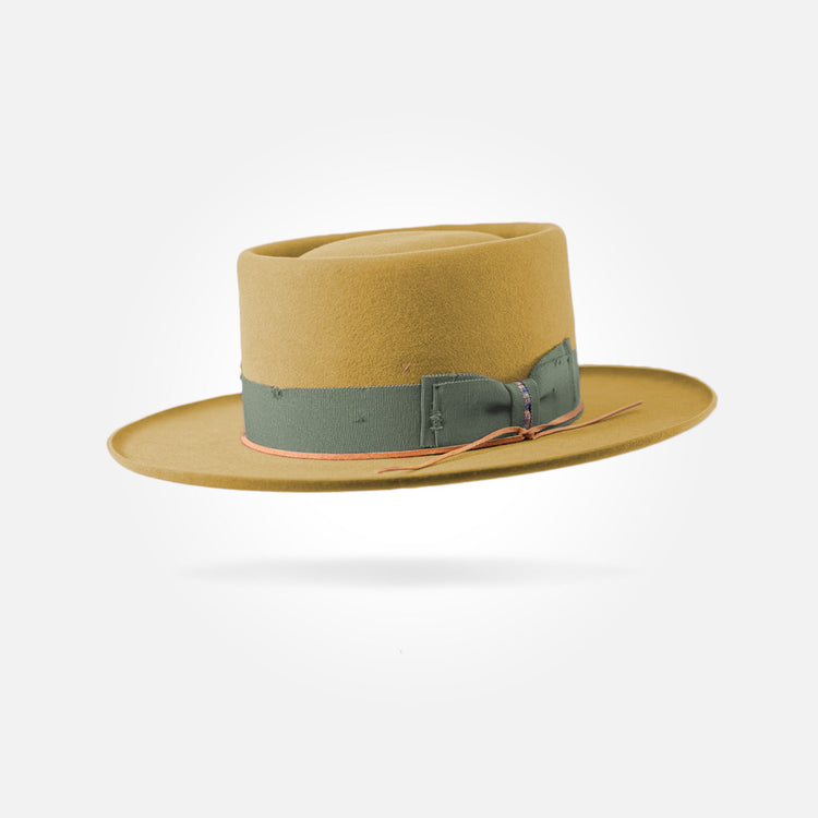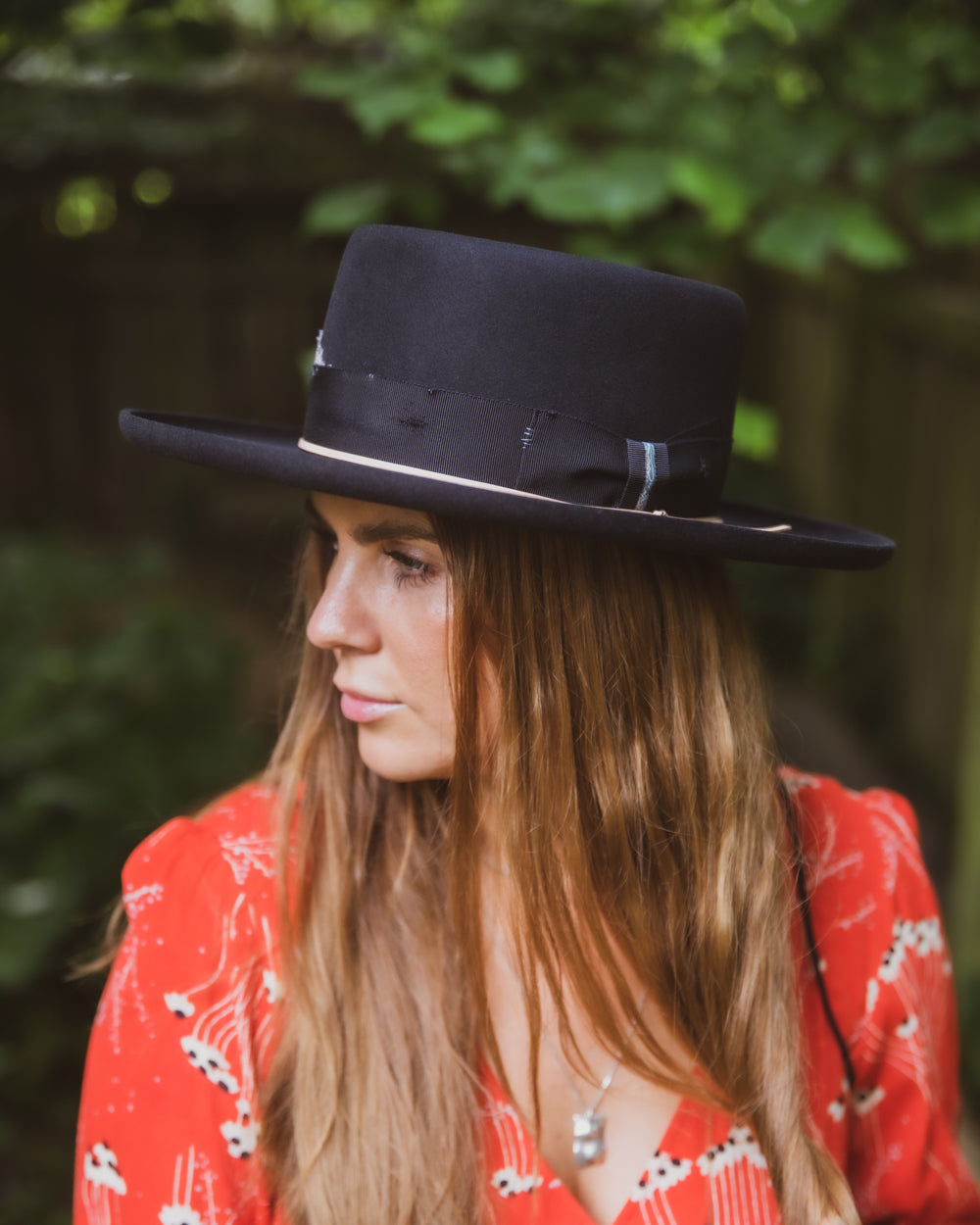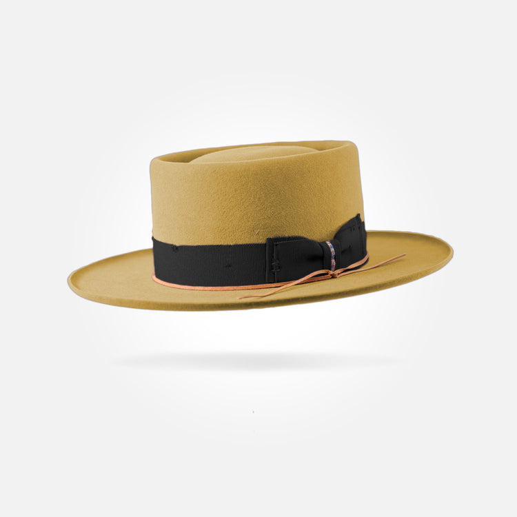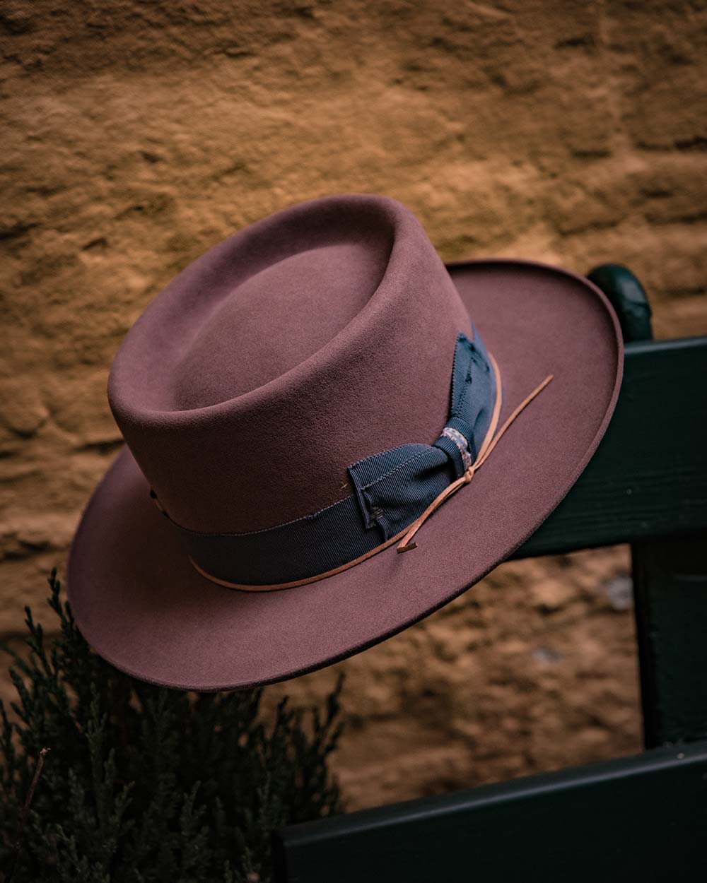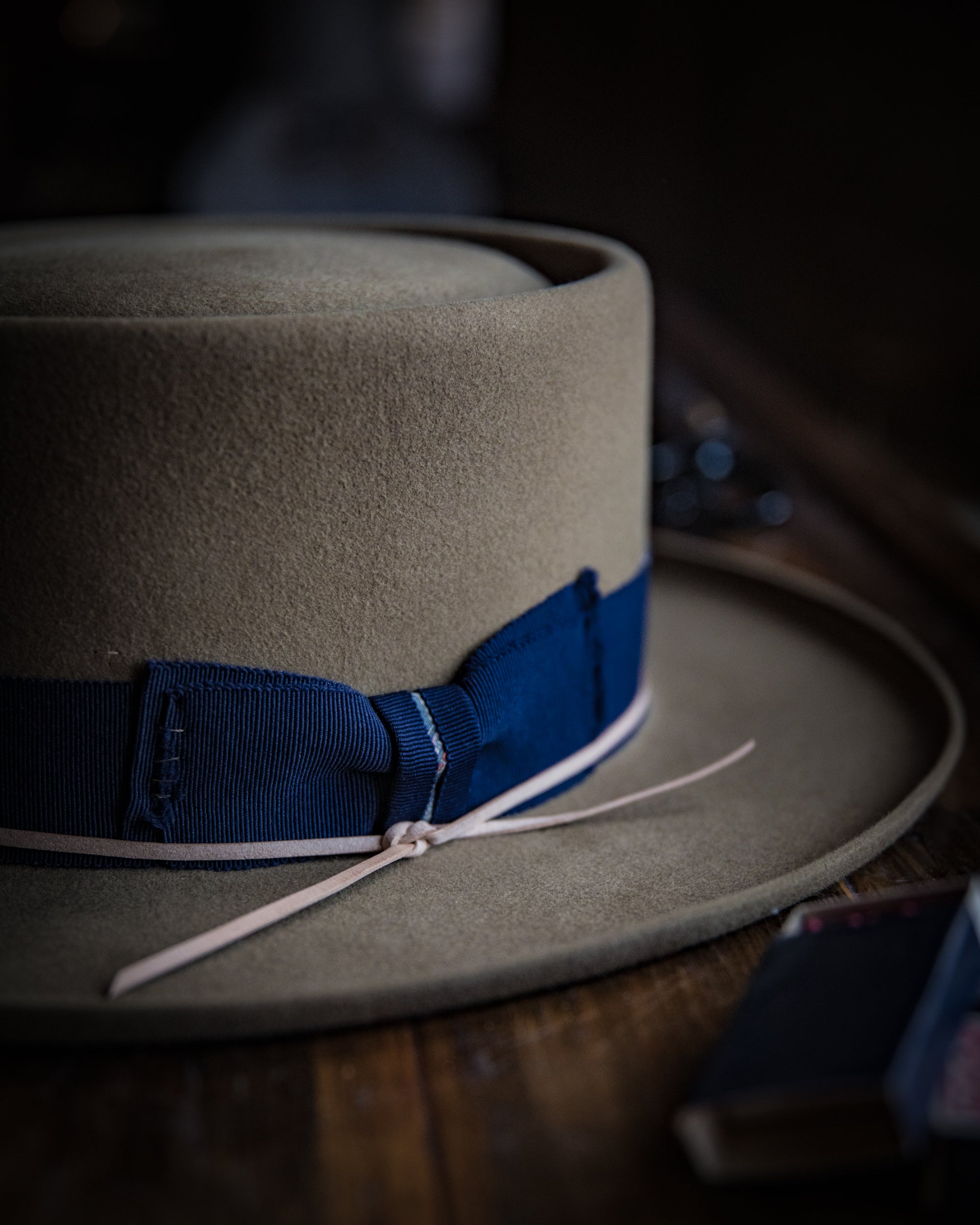 This hat is made from the best materials available. The felt used for this hat is what we call western weight. It has a sturdy, rigid brim and a smooth, pliable crown. It comes in a 50X beaver/hare blend and a pure 100X beaver fur felt.