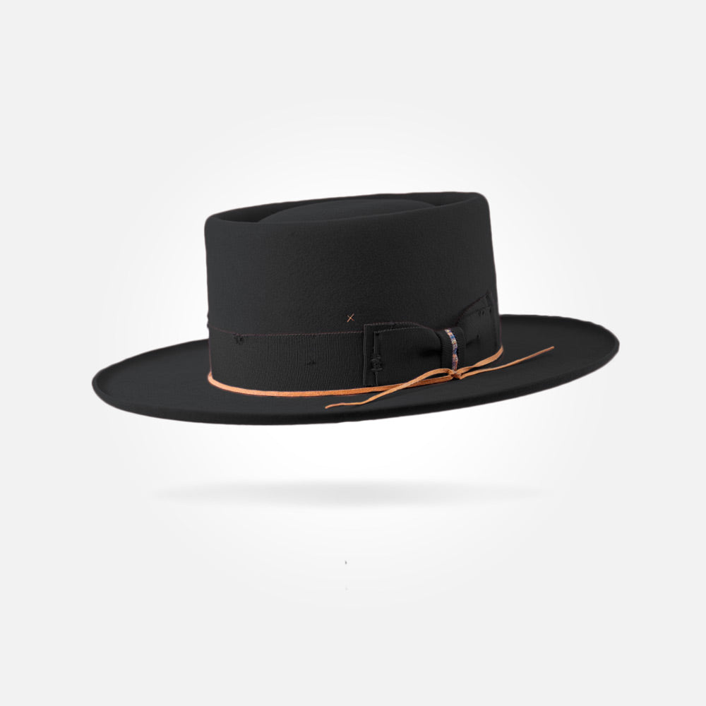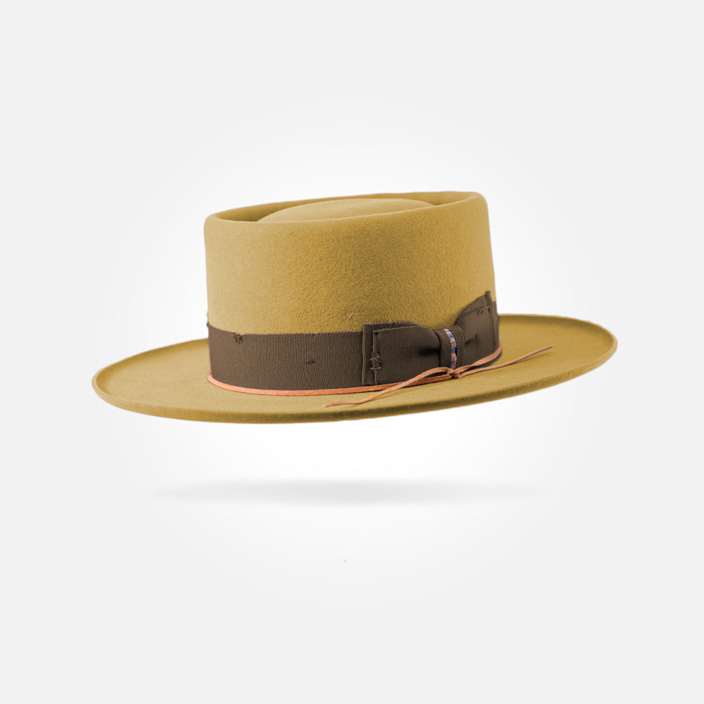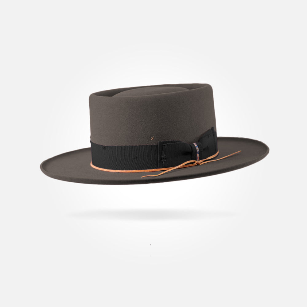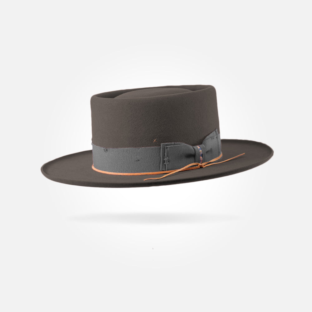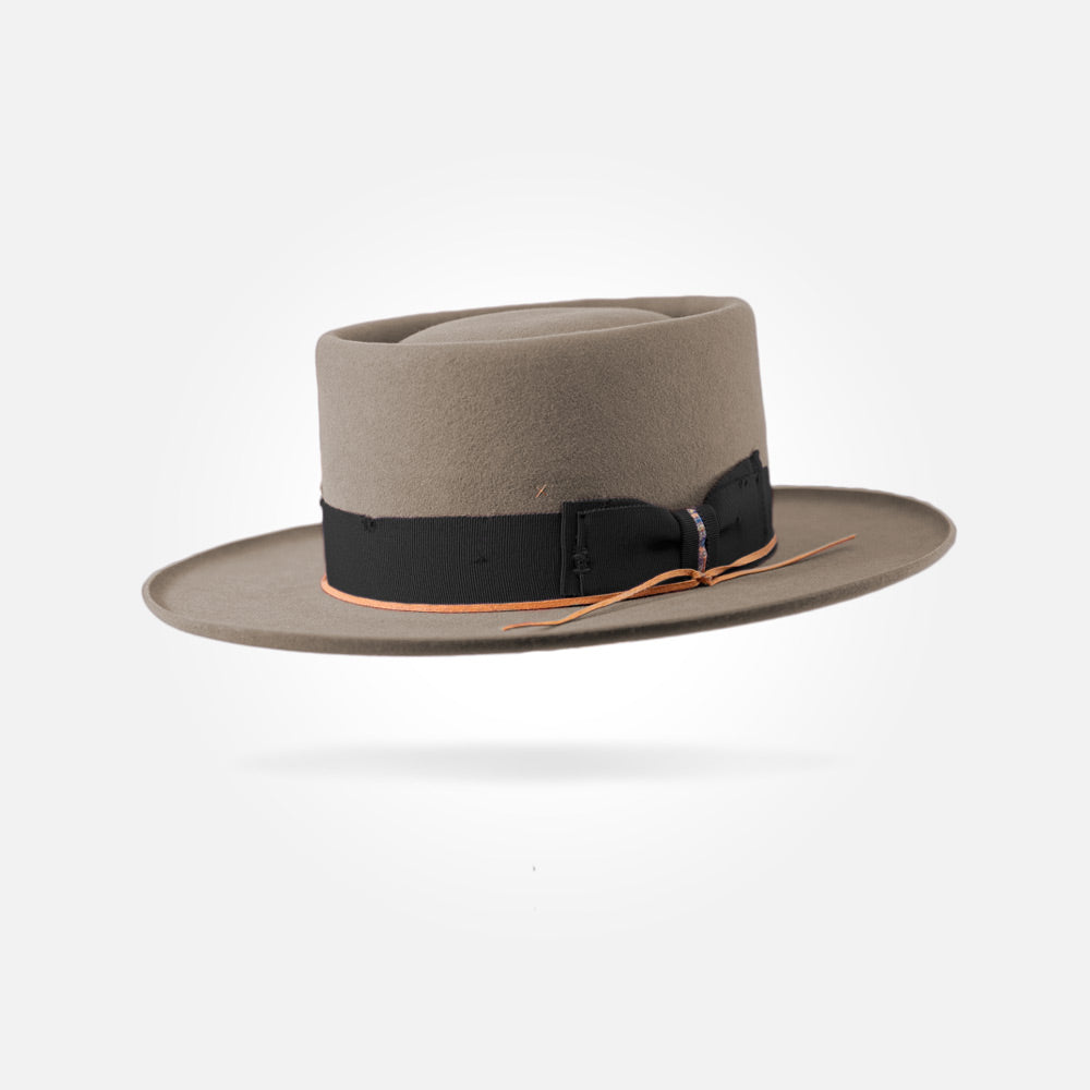This hat is made from the best materials available. The felt used for this hat is what we call western weight. It has a sturdy, rigid brim and a smooth, pliable crown. It comes in a 50X beaver/hare blend and a pure 100X beaver fur felt.