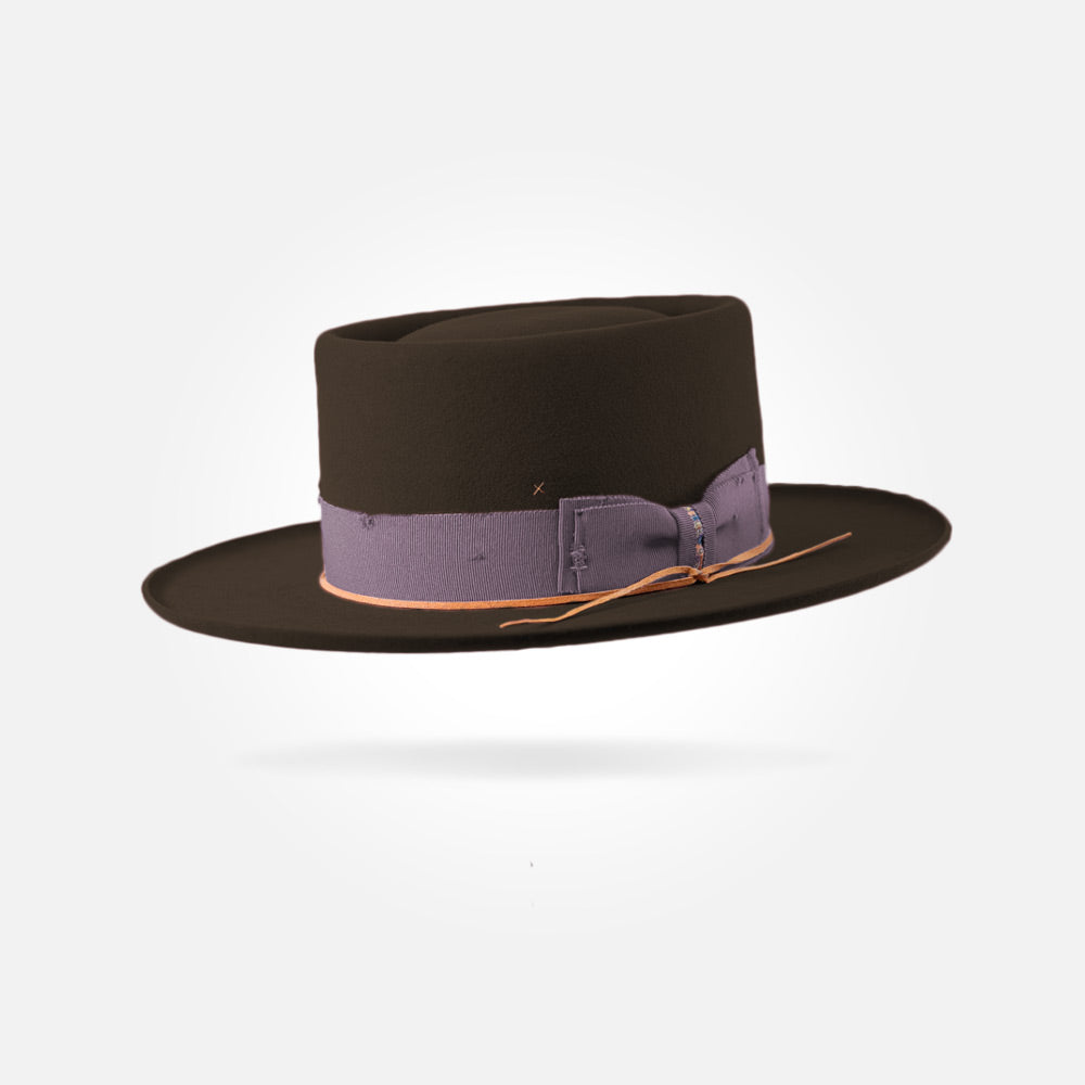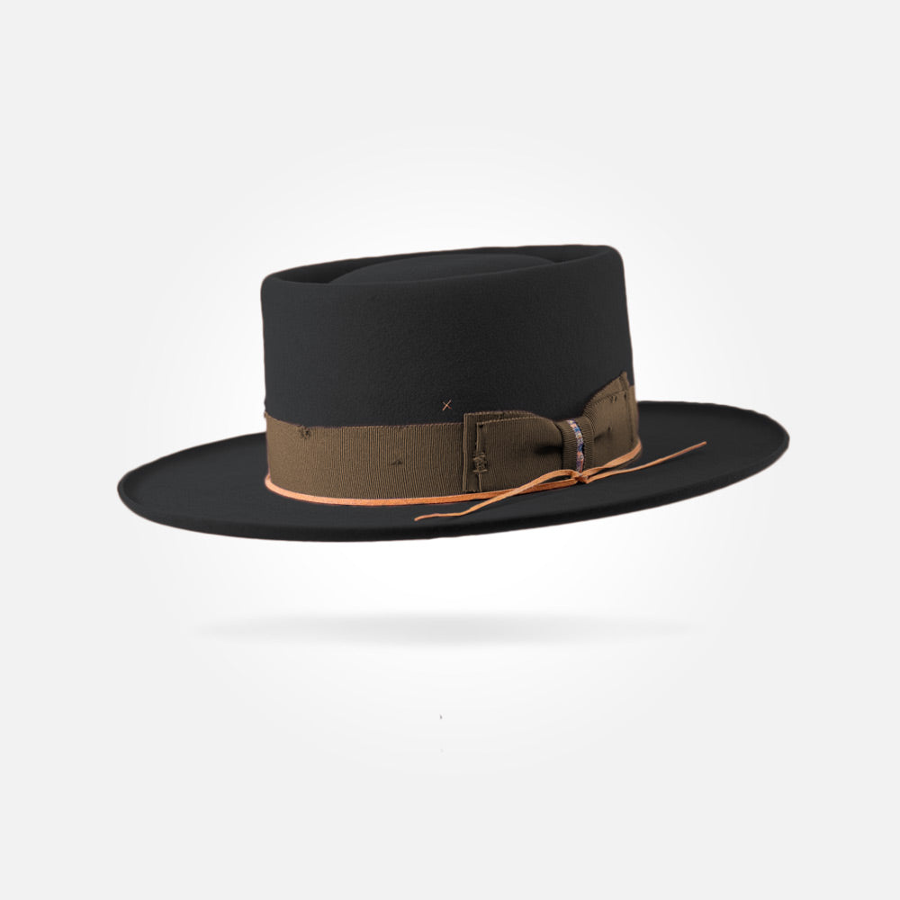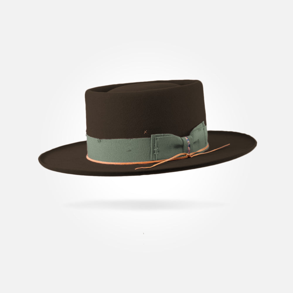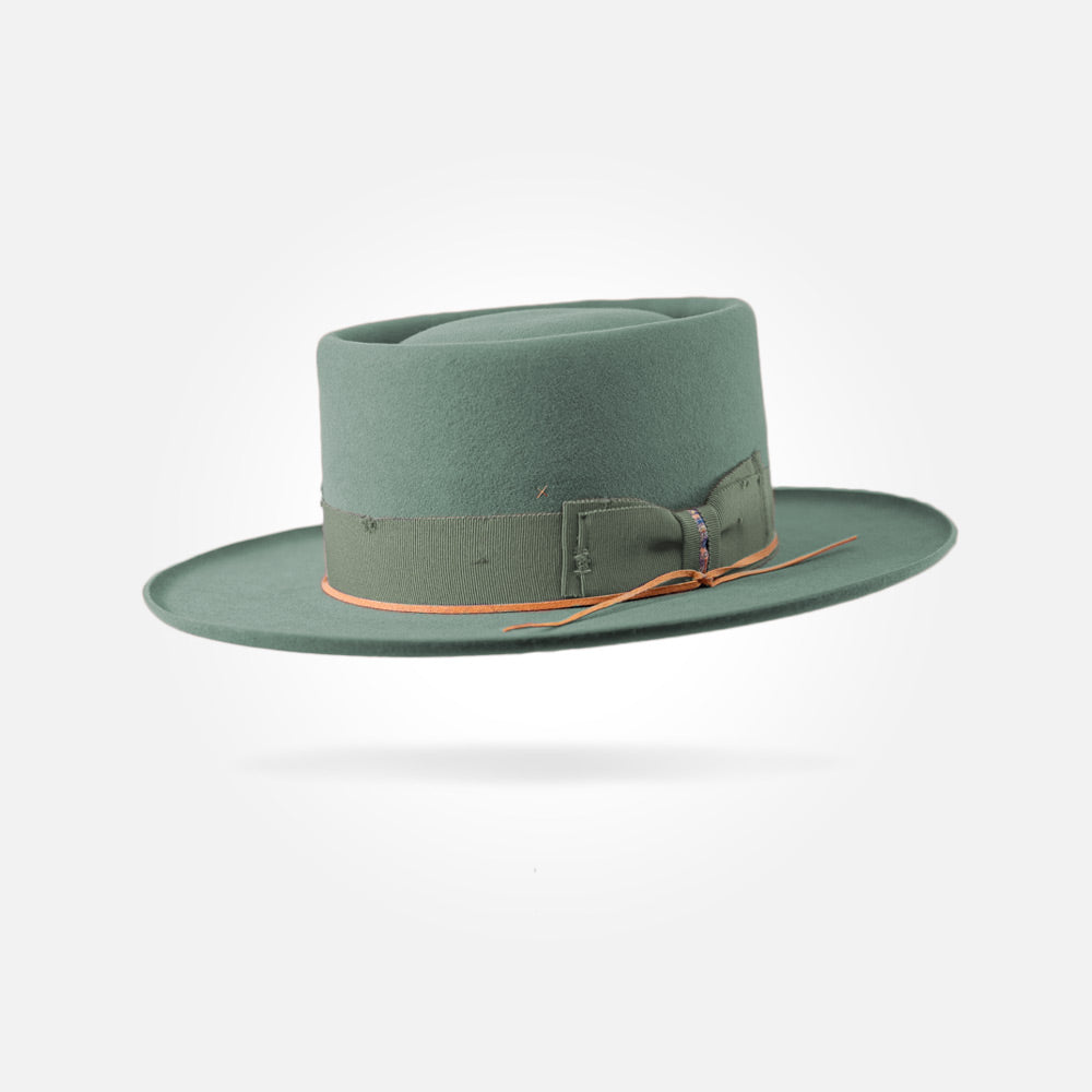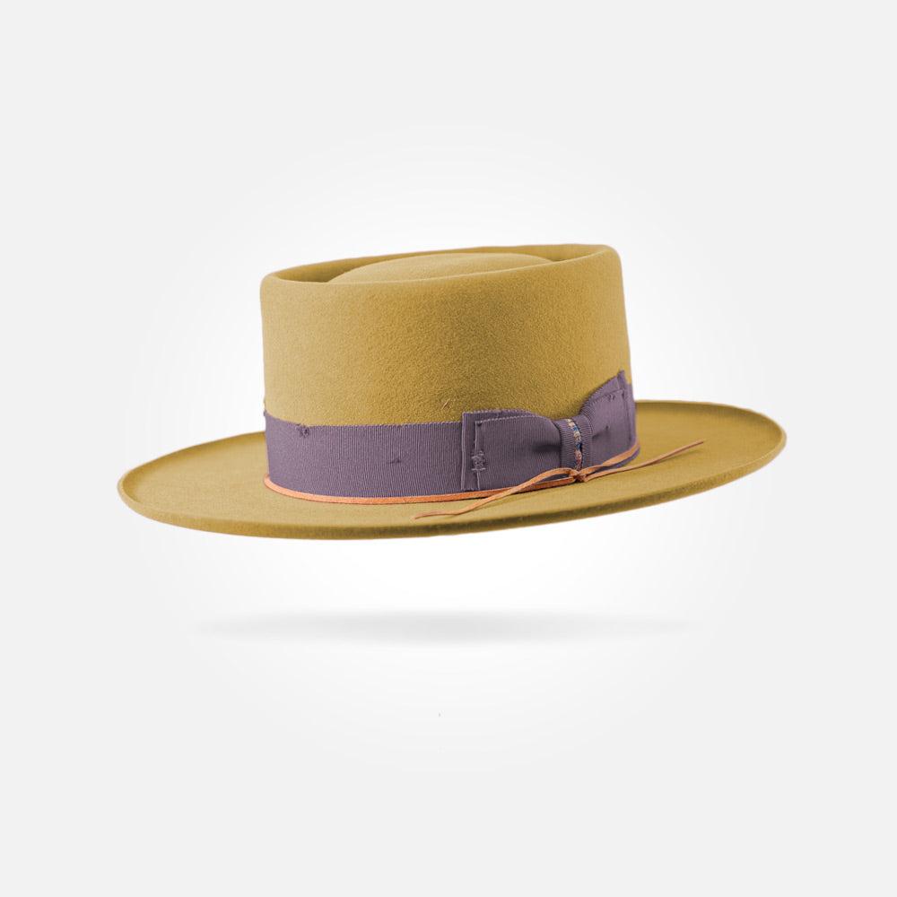This hat is made from the best materials available. The felt used for this hat is what we call western weight. It has a sturdy, rigid brim and a smooth, pliable crown. It comes in a 50X beaver/hare blend and a pure 100X beaver fur felt.