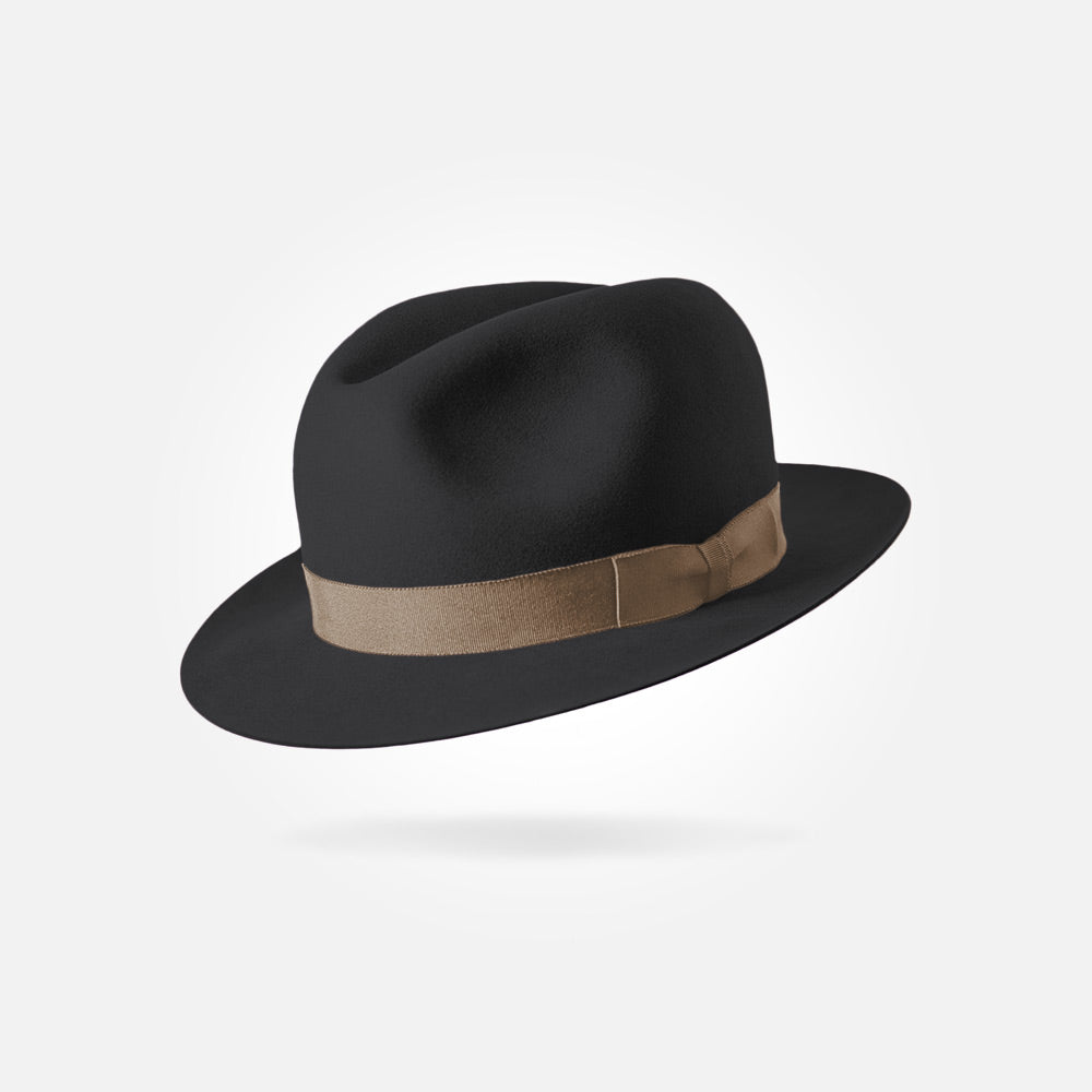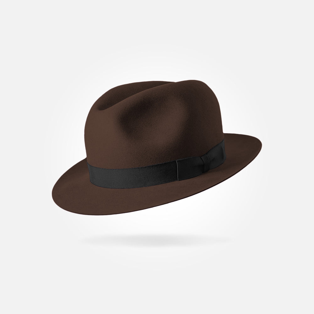 This is a medium height centre dent fedora with a 5.5 cm / 2.17 in snap brim.It features a 25 mm modern grosgrain hatband with a classic bow.