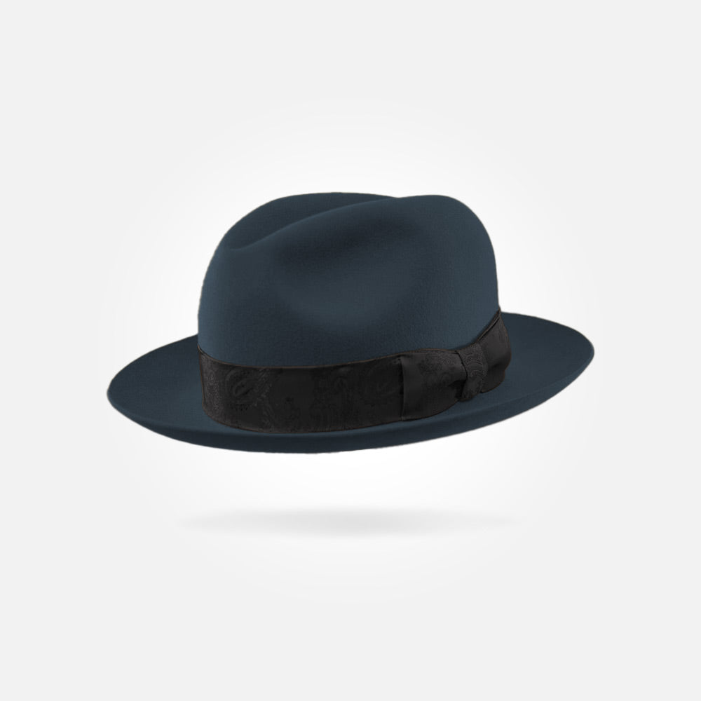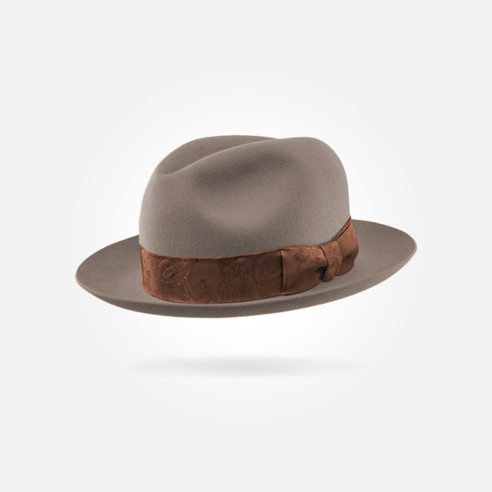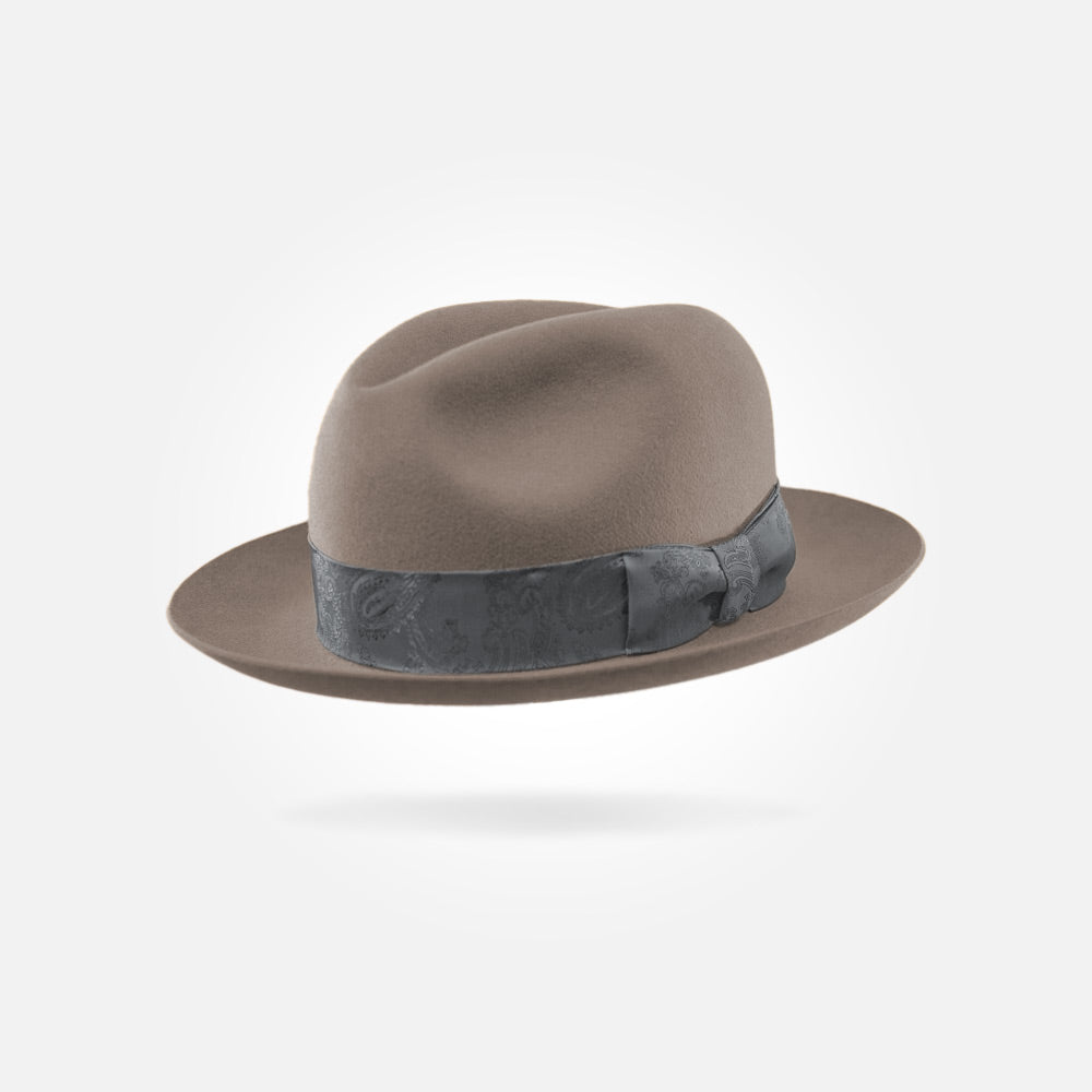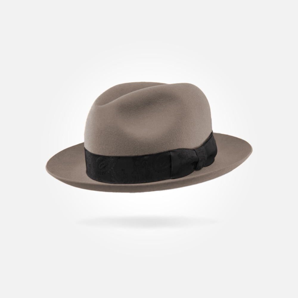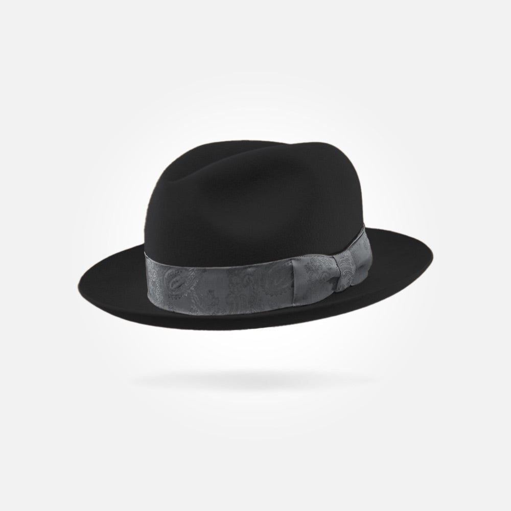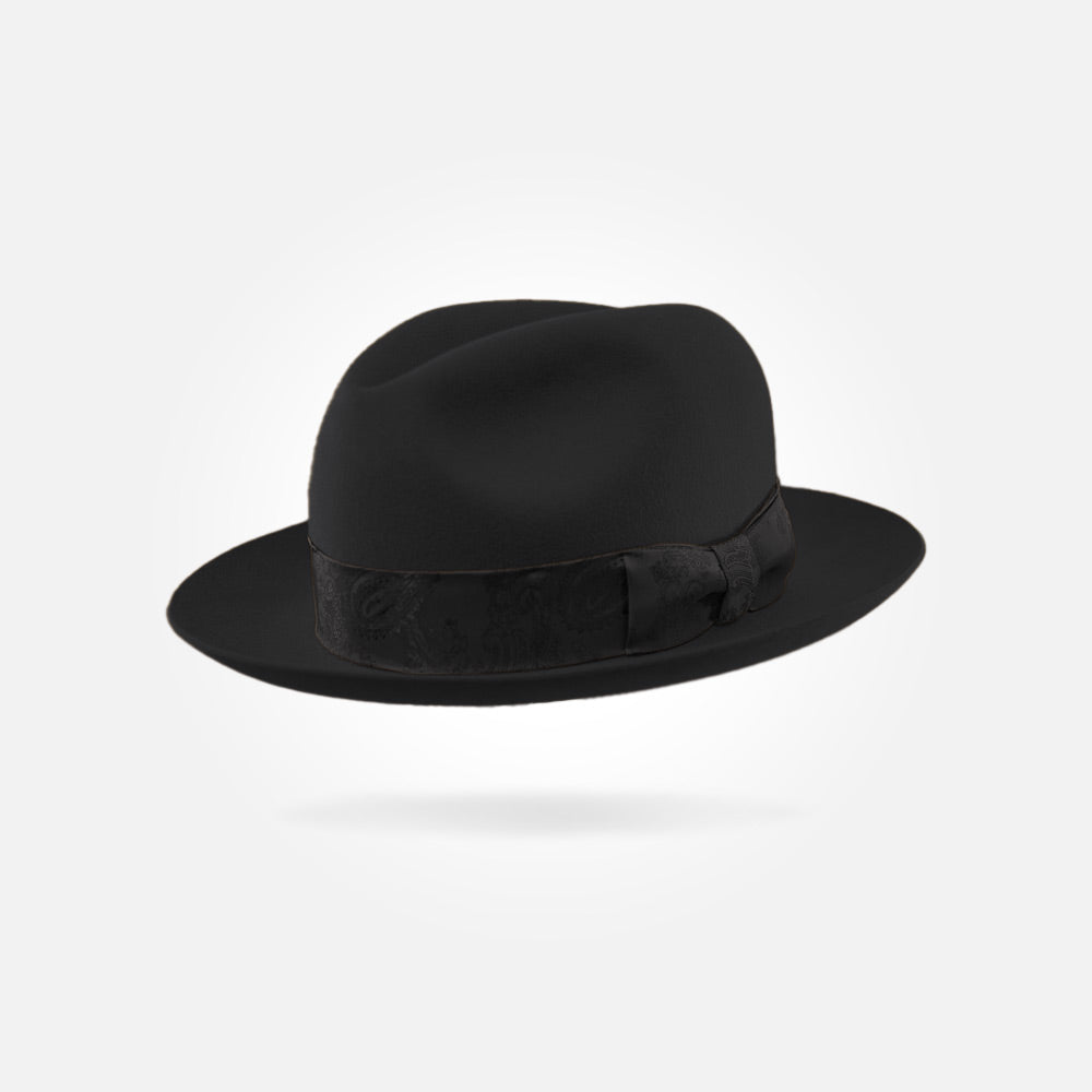 This is a medium height classic centre dent fedora with a 6.5 cm / 2.55 in snap brim.It features a 38 mm paisley hatband with a classic back bow.