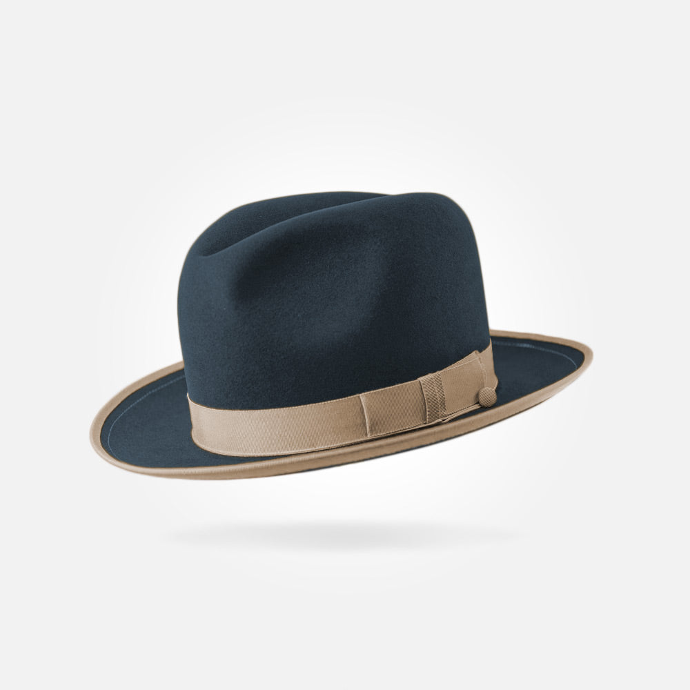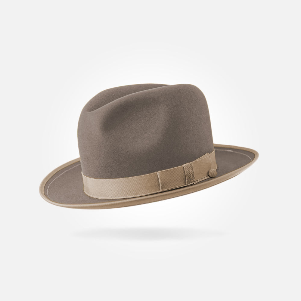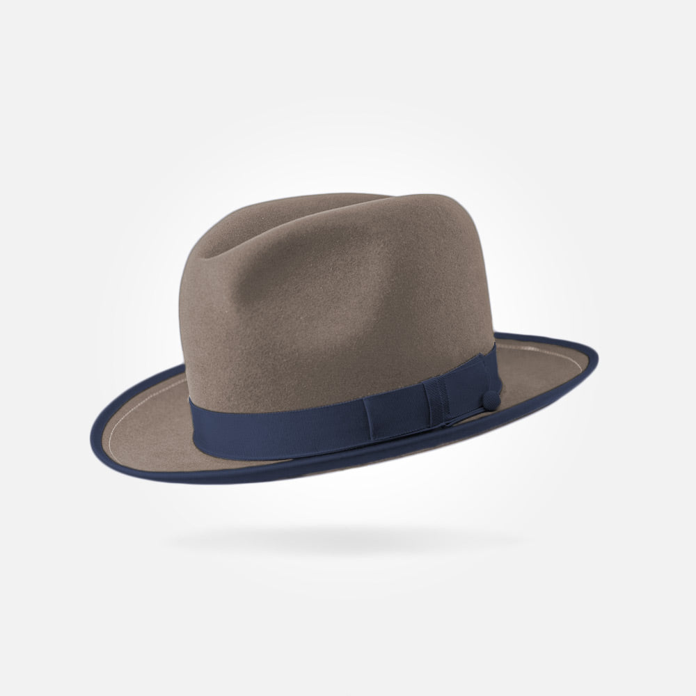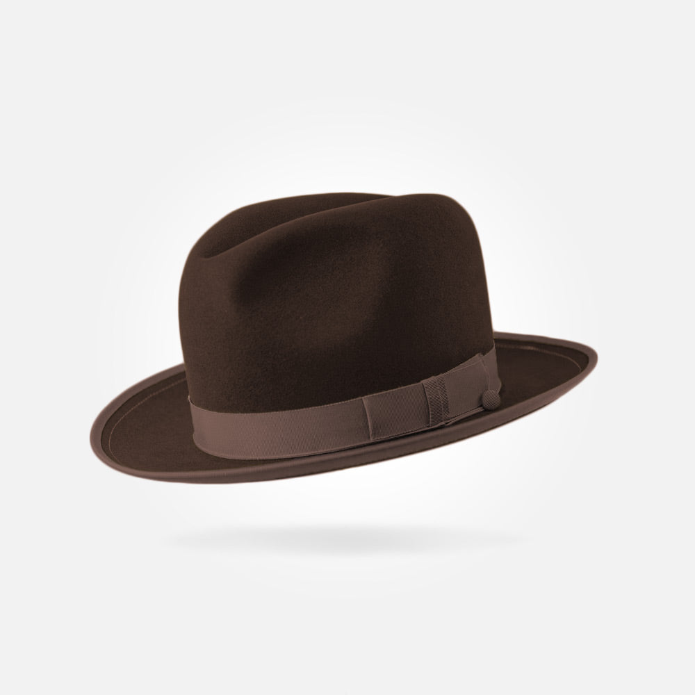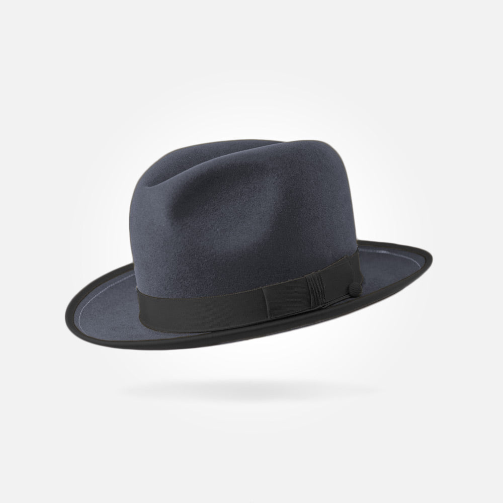 This is a tall height classic centre dent fedora with a 6,5 cm / 2.55 in bound snap brim. It features a 25 mm modern grosgrain hatband and a fully functional wind cord.