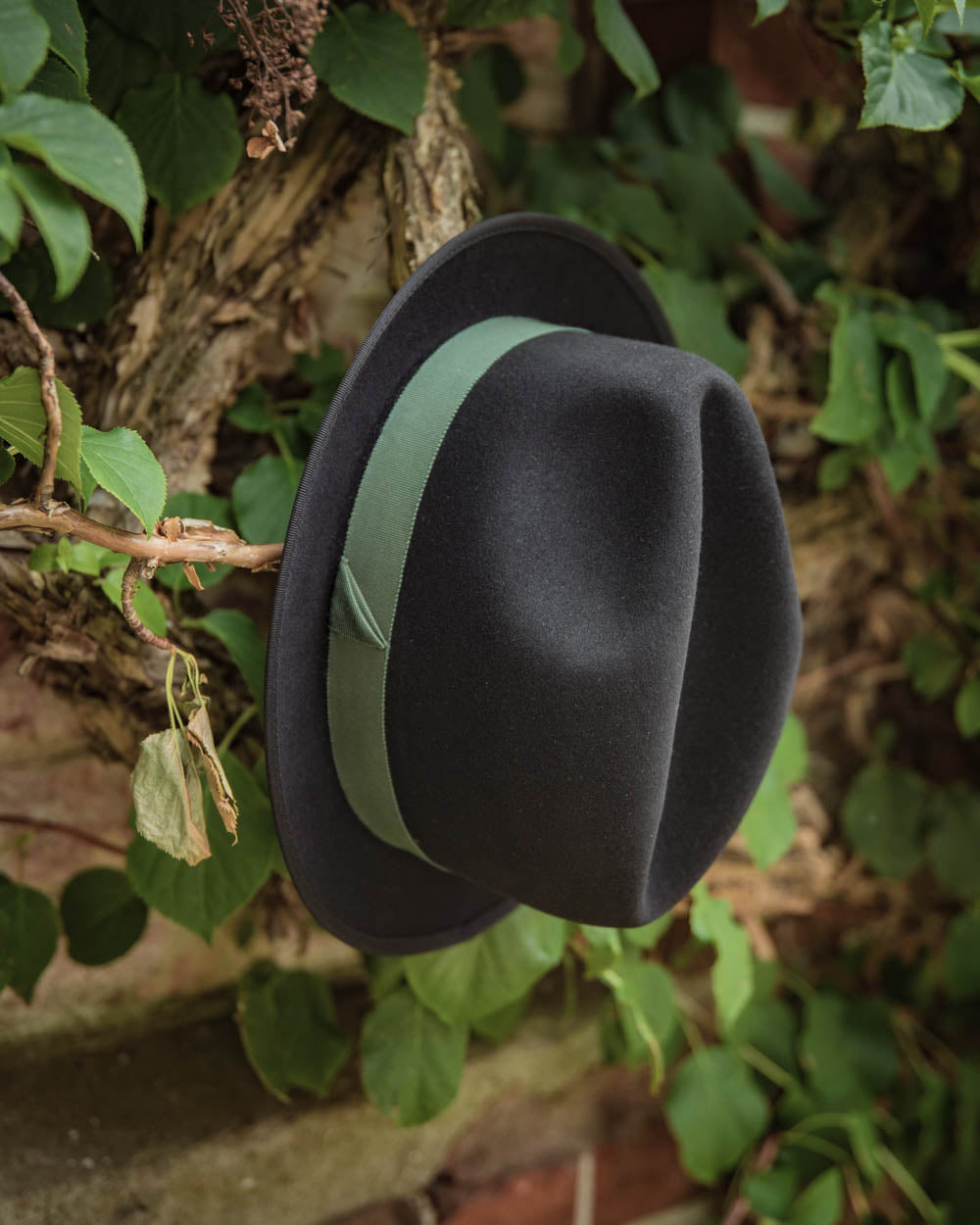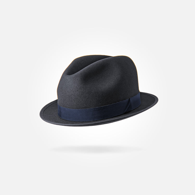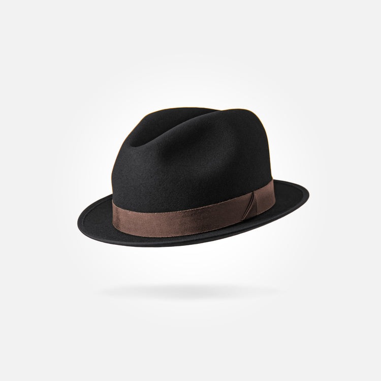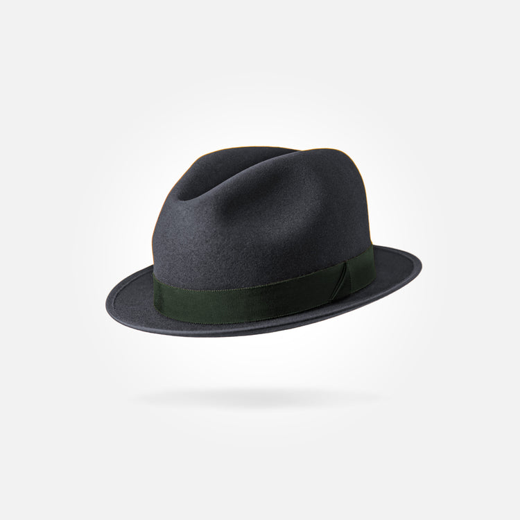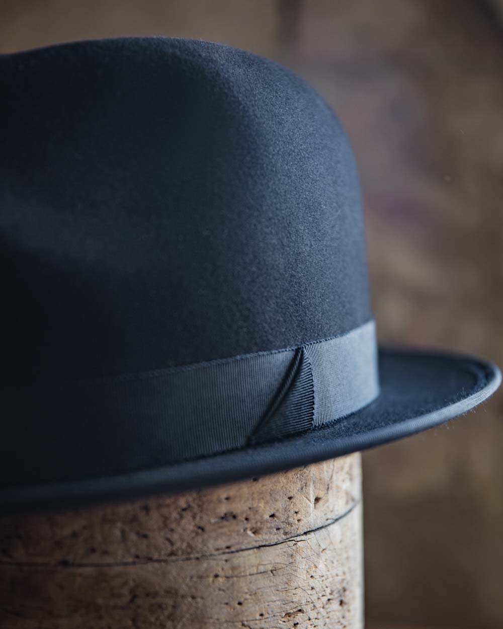 This is a medium height centre dent fedora with a 4 cm / 1.57 in bound curved brim. It features a 25 mm modern grosgrain hatband.