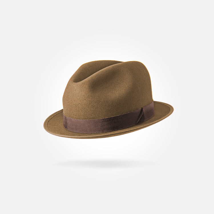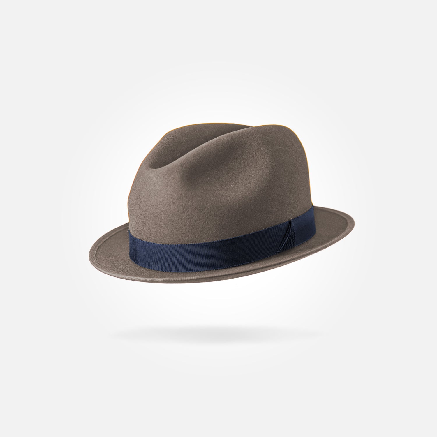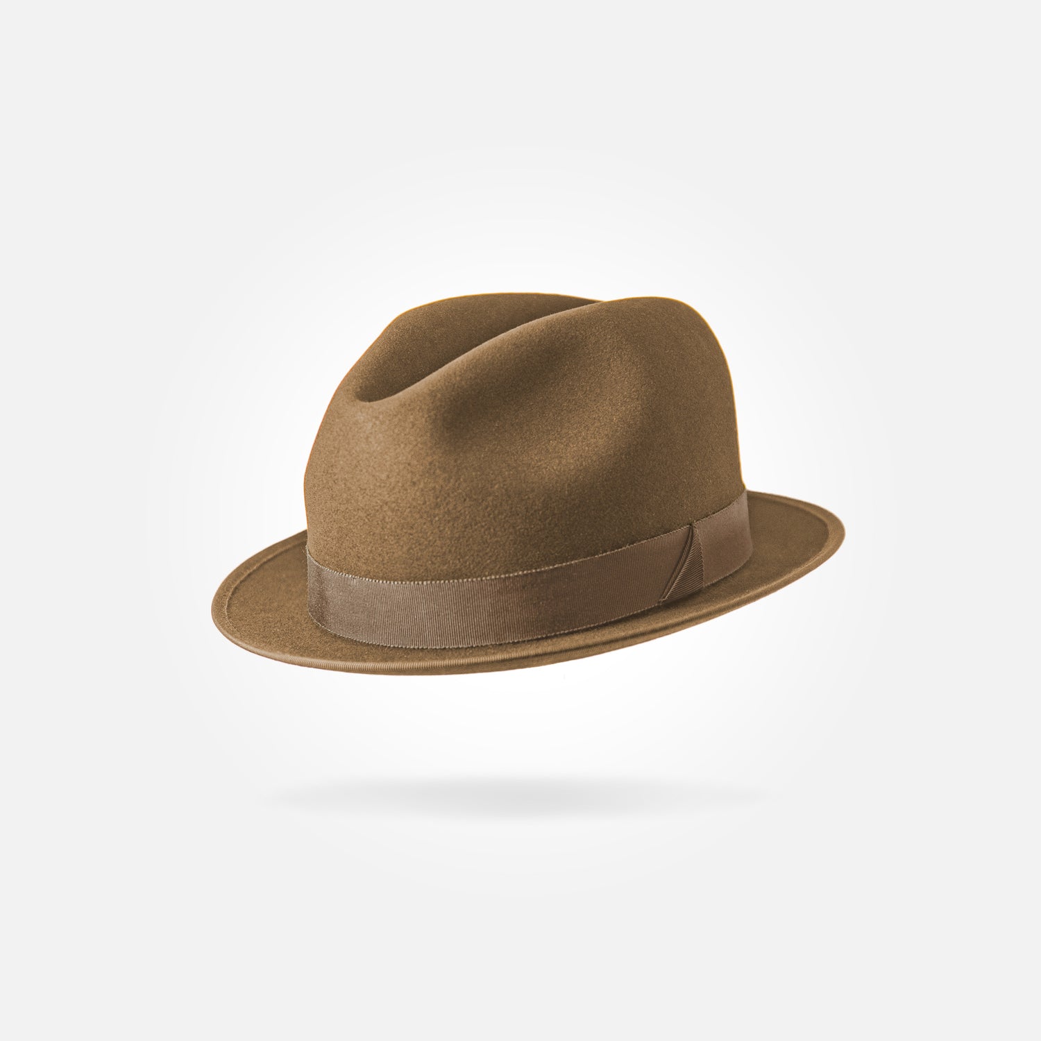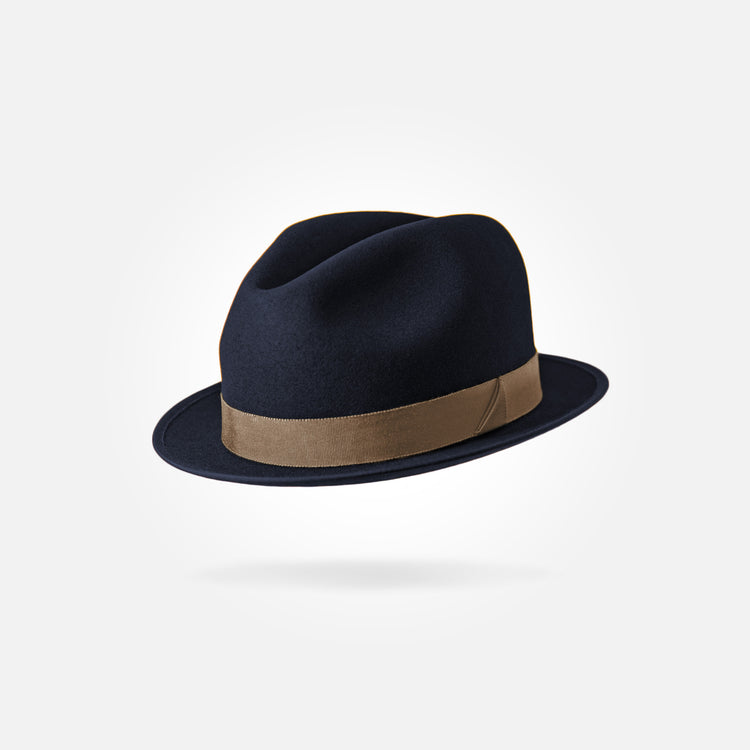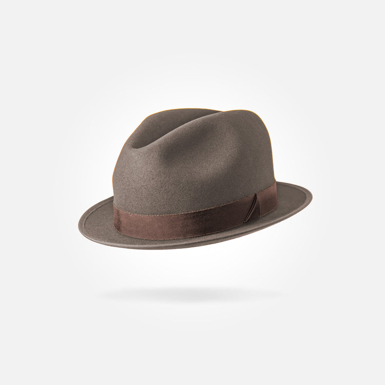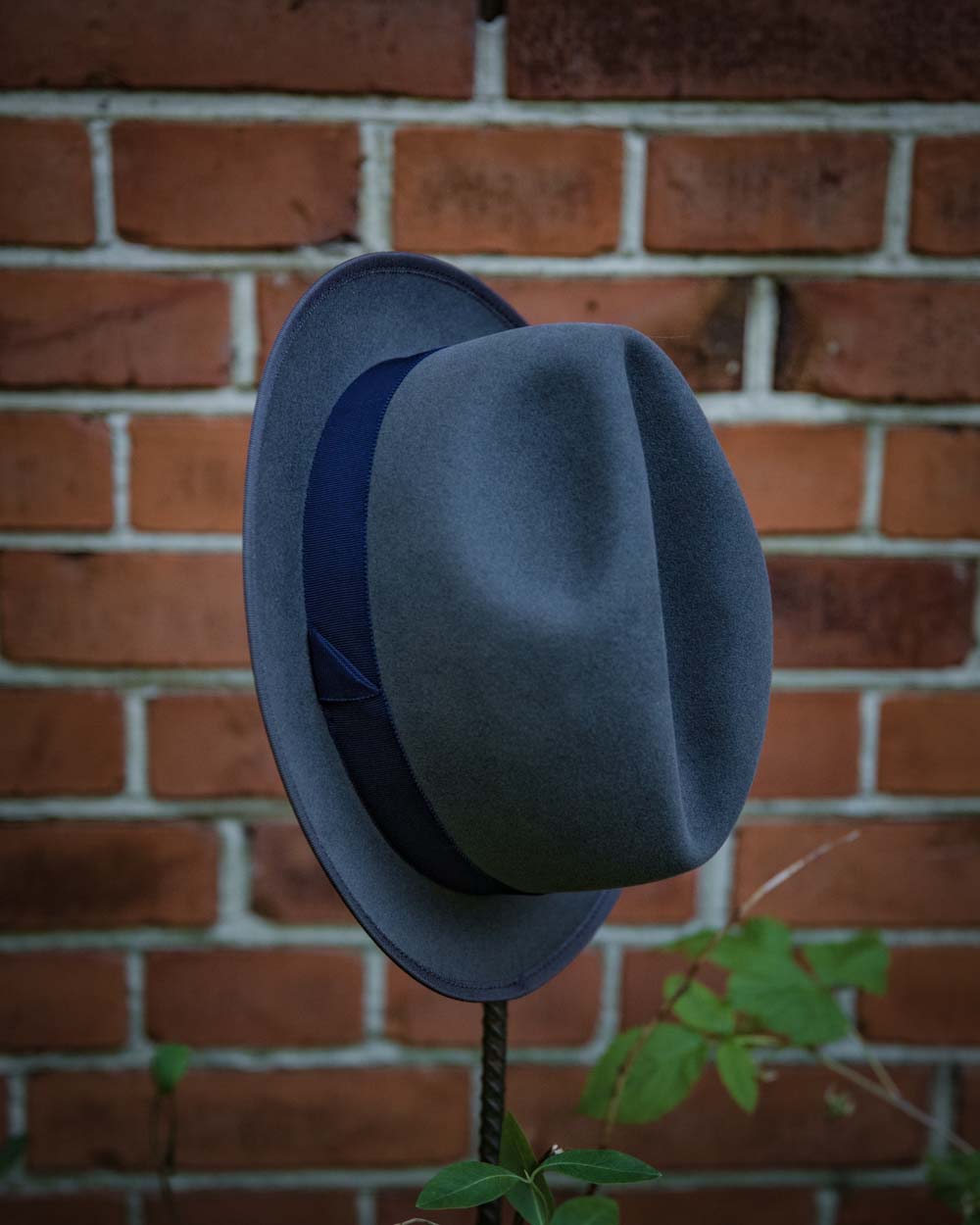 This is a medium height centre dent fedora with a 4 cm / 1.57 in bound curved brim. It features a 25 mm modern grosgrain hatband.