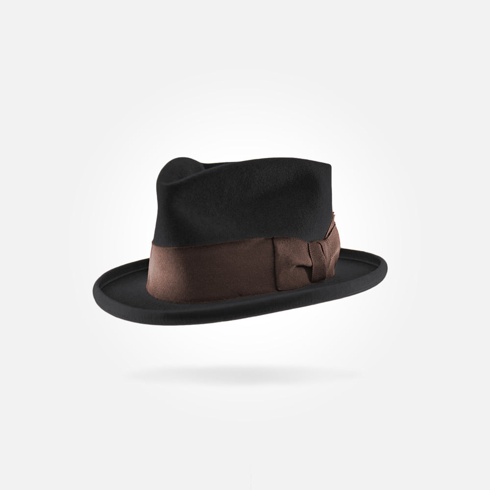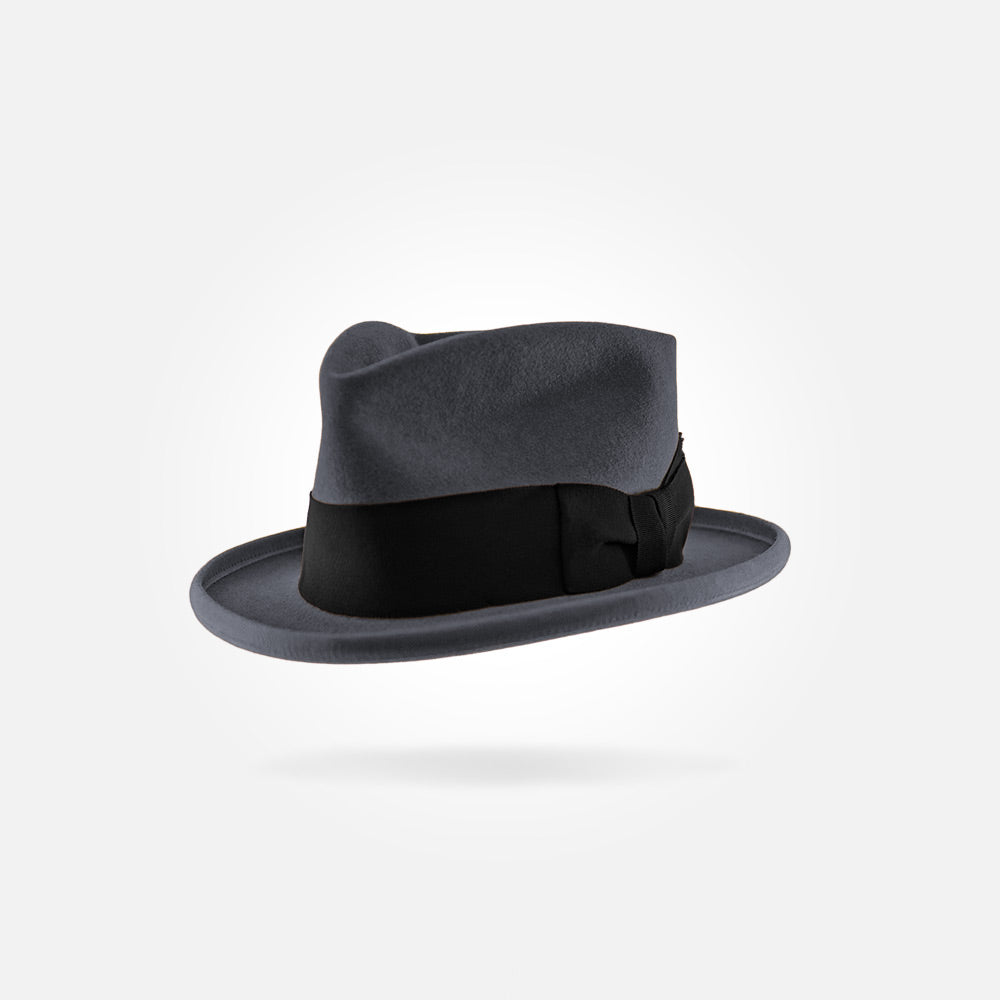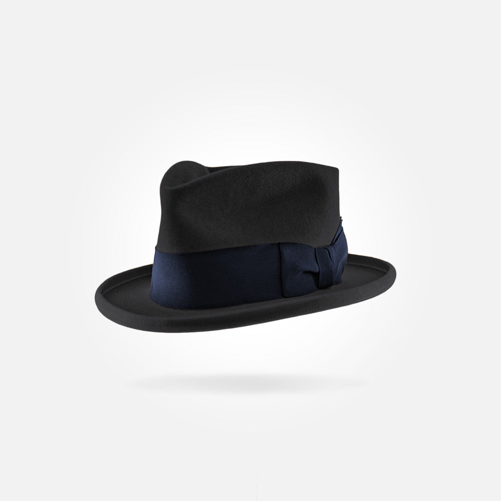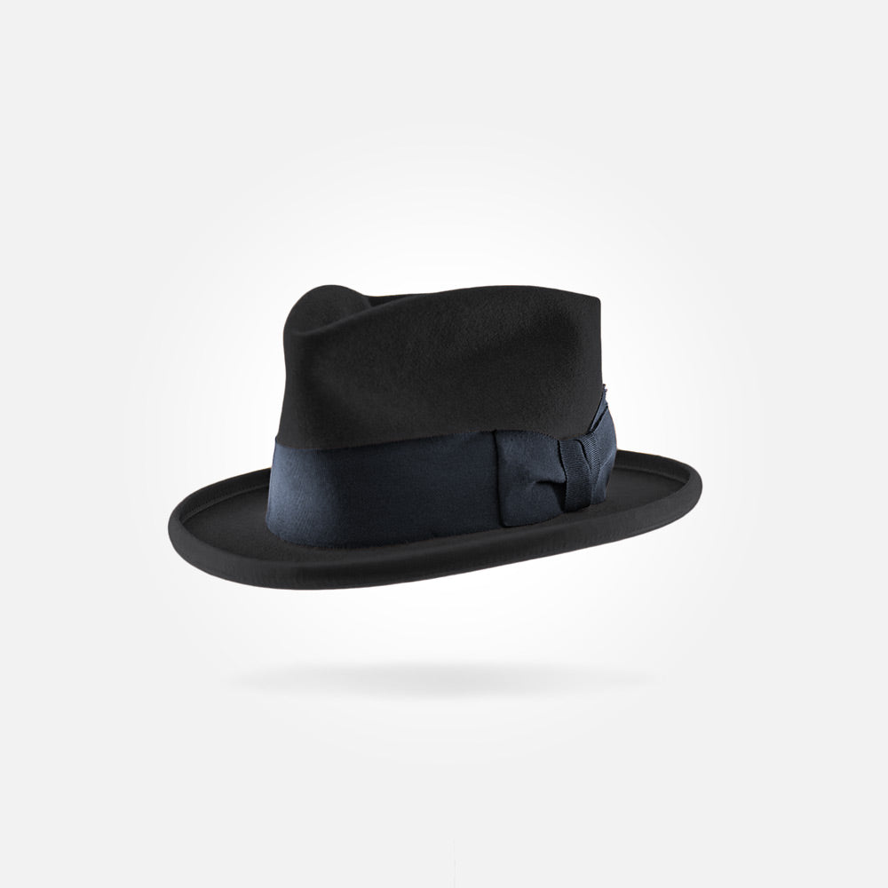 This is a tall height classic diamond fedora with a 5 cm / 1.95 in bound pencil roll brim. It features a 50 mm modern grosgrain hatband with a classic double back bow in.