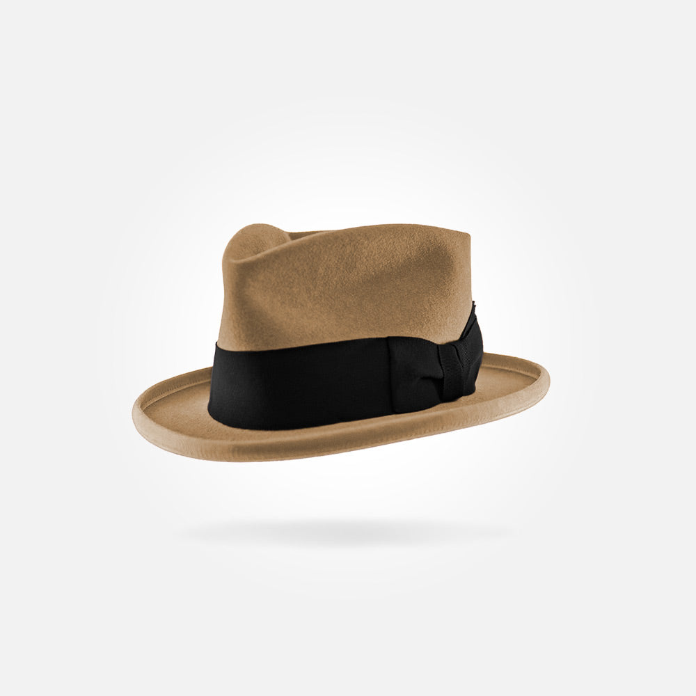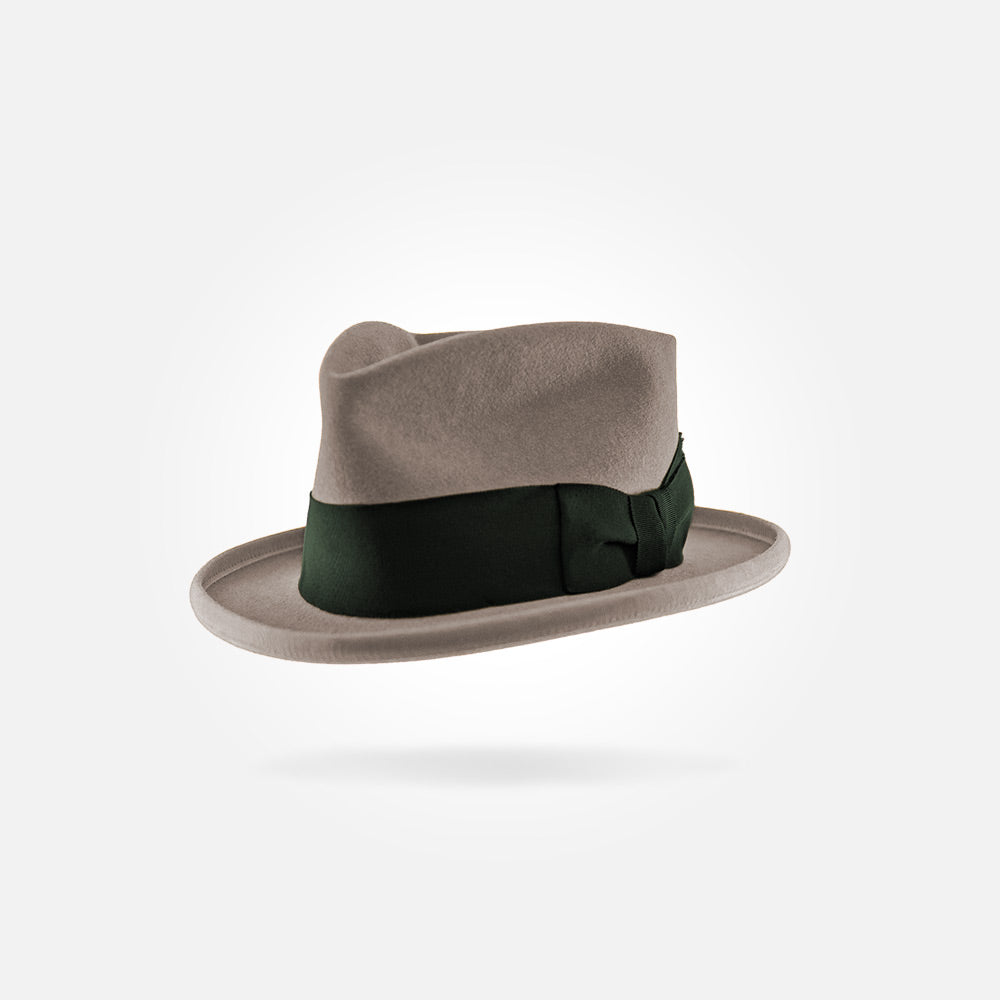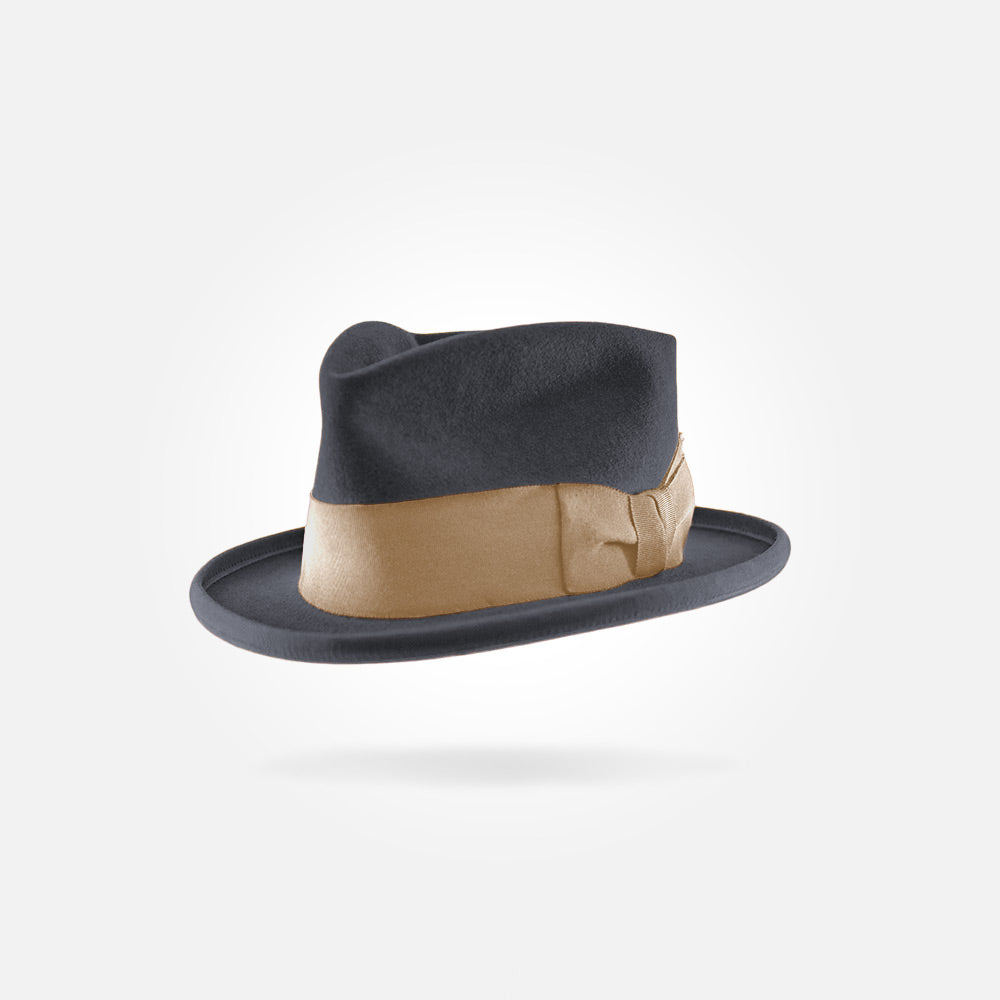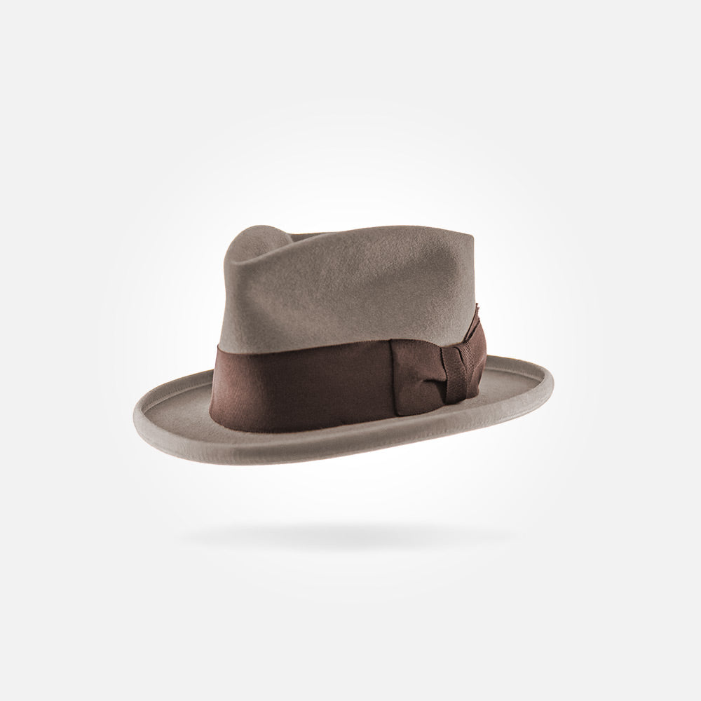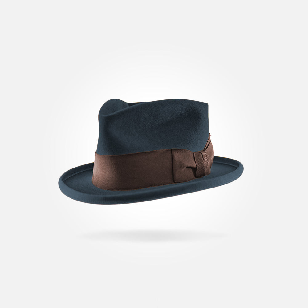 This is a tall height classic diamond fedora with a 5 cm / 1.95 in bound pencil roll brim. It features a 50 mm modern grosgrain hatband with a classic double back bow in.