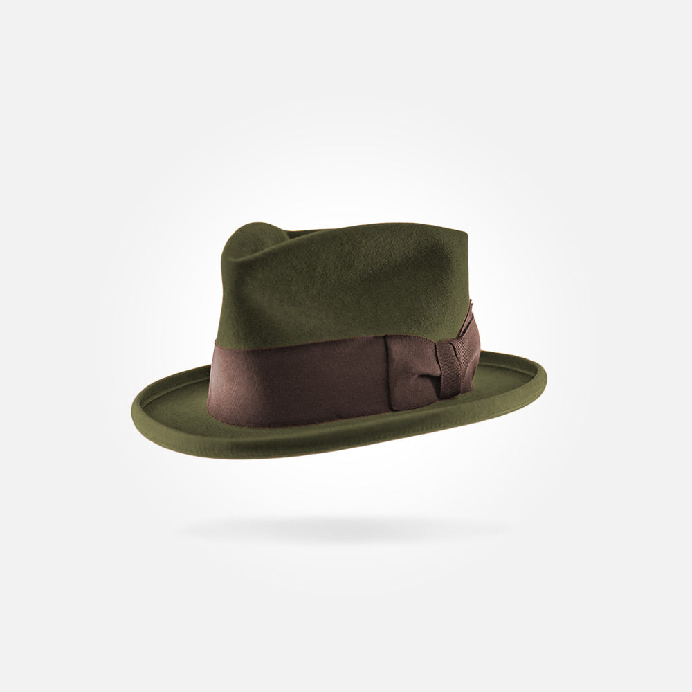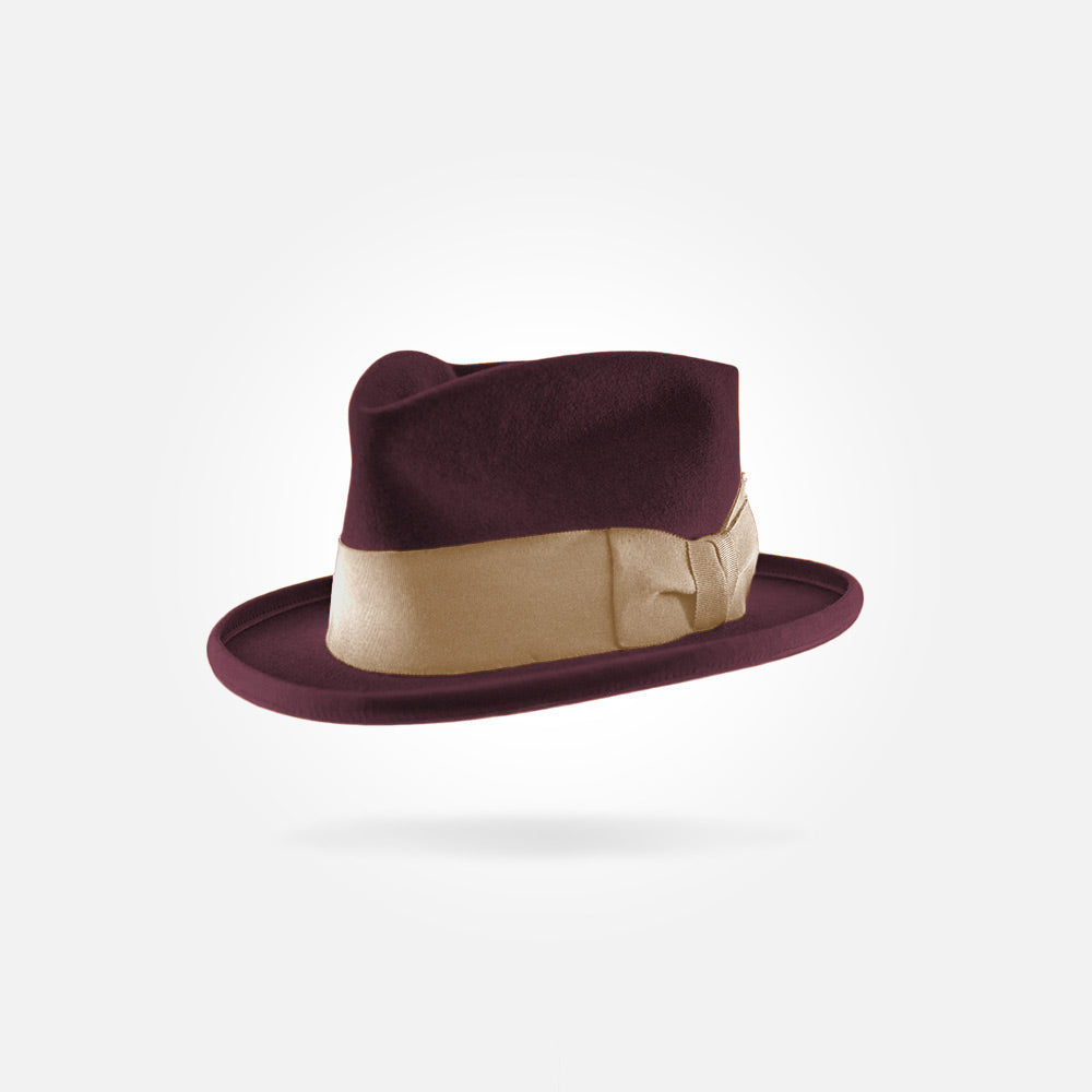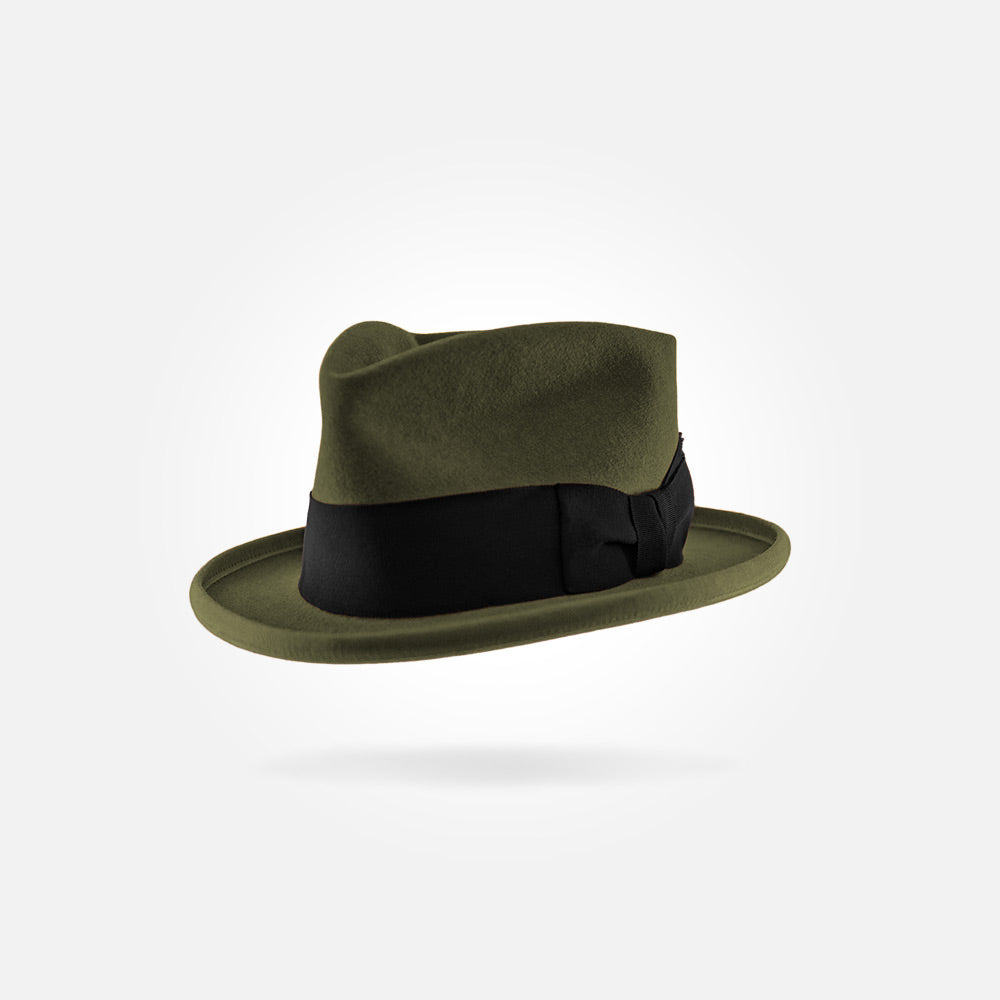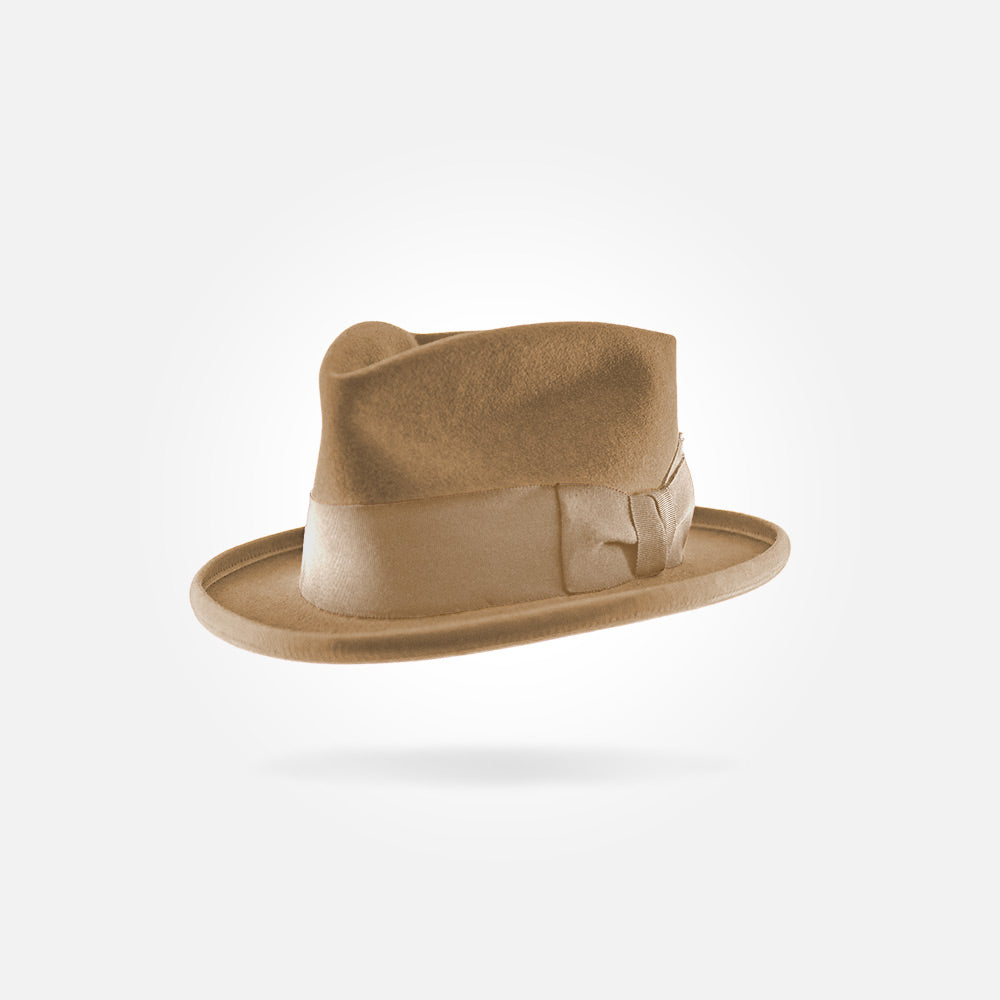 This is a tall height classic diamond fedora with a 5 cm / 1.95 in bound pencil roll brim. It features a 50 mm modern grosgrain hatband with a classic double back bow in.