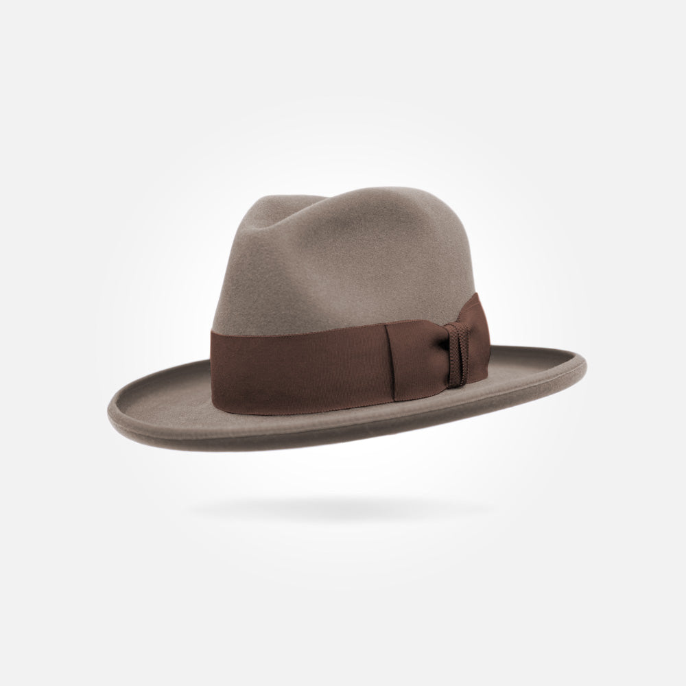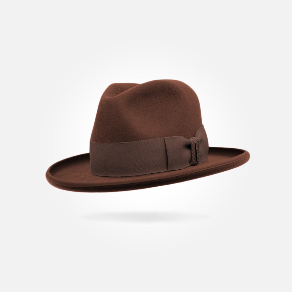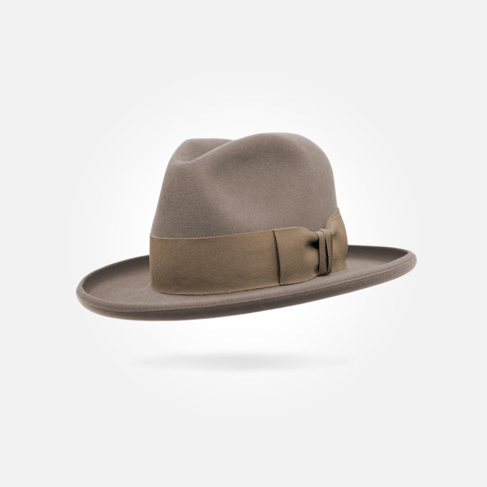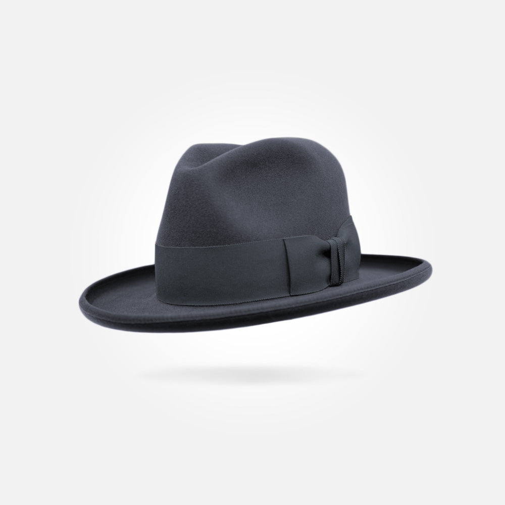 This is a medium height classic centre dent fedora with a 7 cm / 2.75 in bound pencil roll brim. It features a 50 mm modern grosgrain hatband with a classic double back bow.