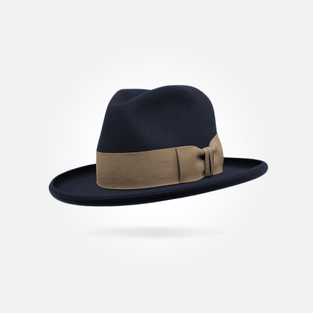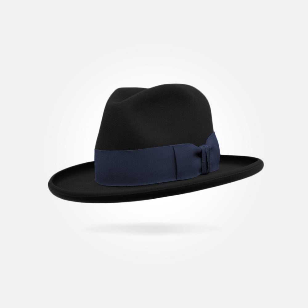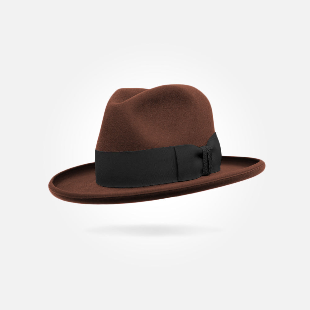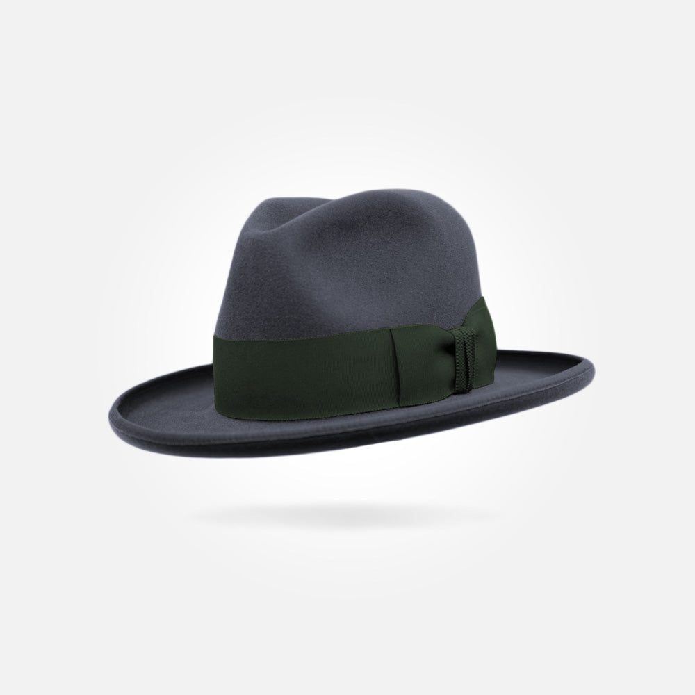 This is a medium height classic centre dent fedora with a 7 cm / 2.75 in bound pencil roll brim. It features a 50 mm modern grosgrain hatband with a classic double back bow.