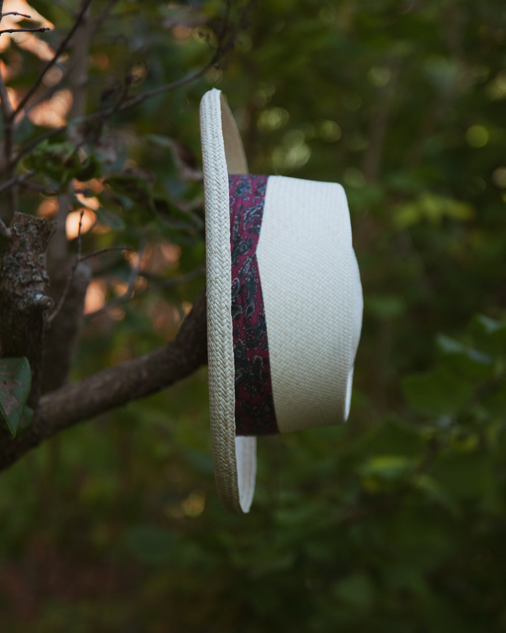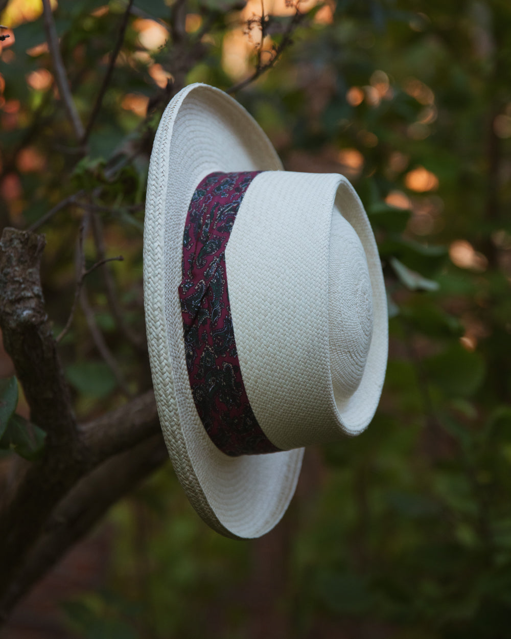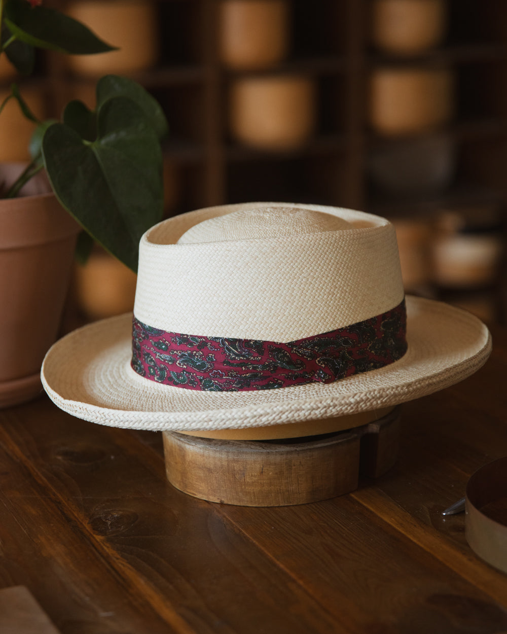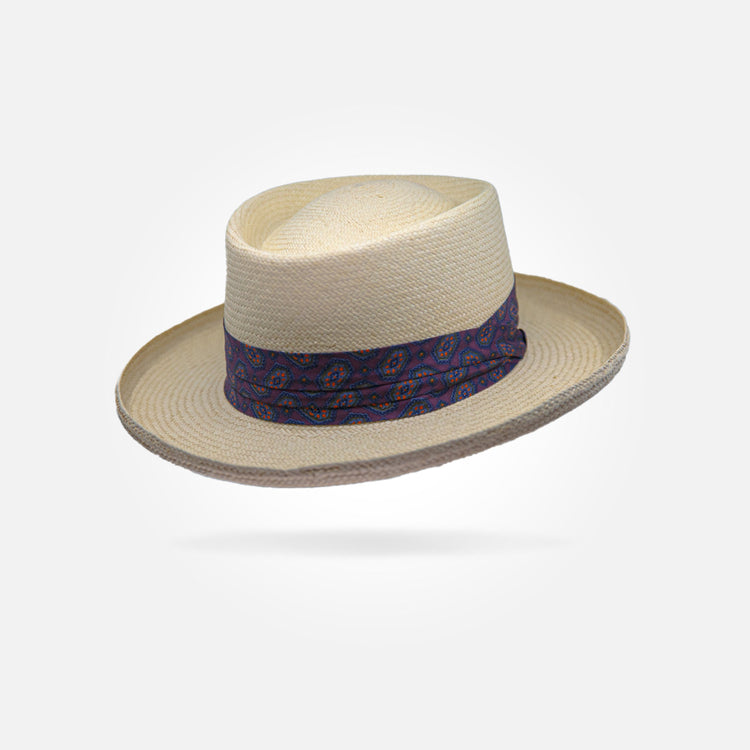 This is a medium height Pork Pie panama with a 7.5 cm / 2.95 in pencil roll brim. It features a 38 mm puggaree hatband.