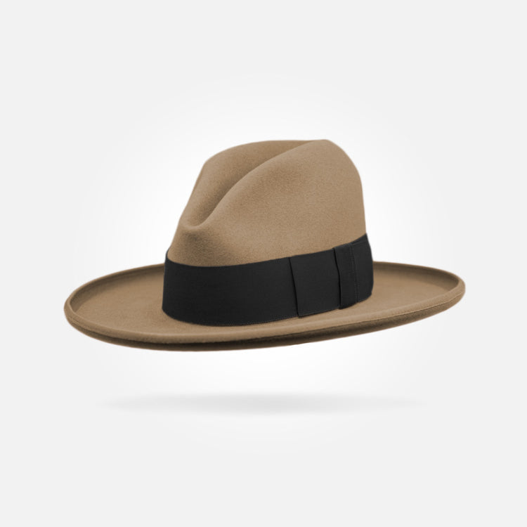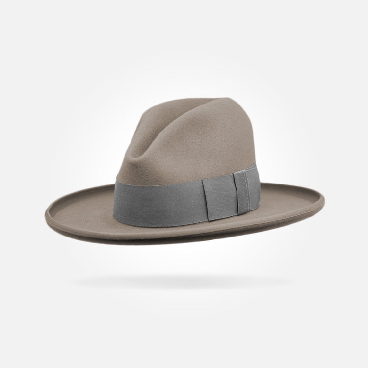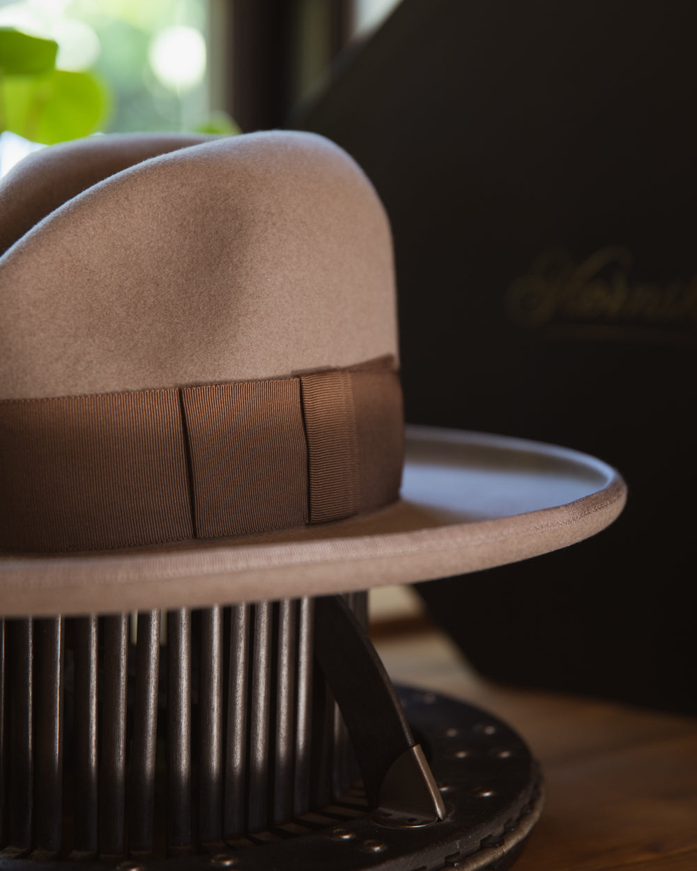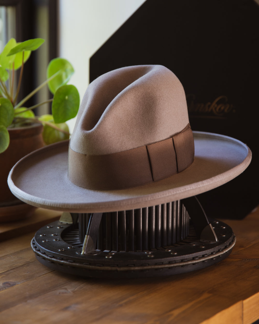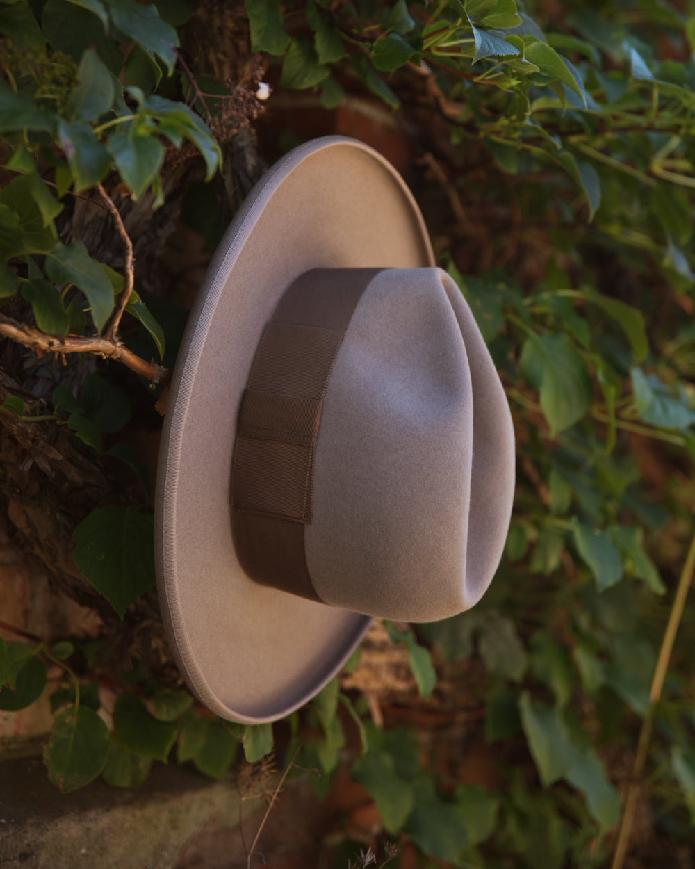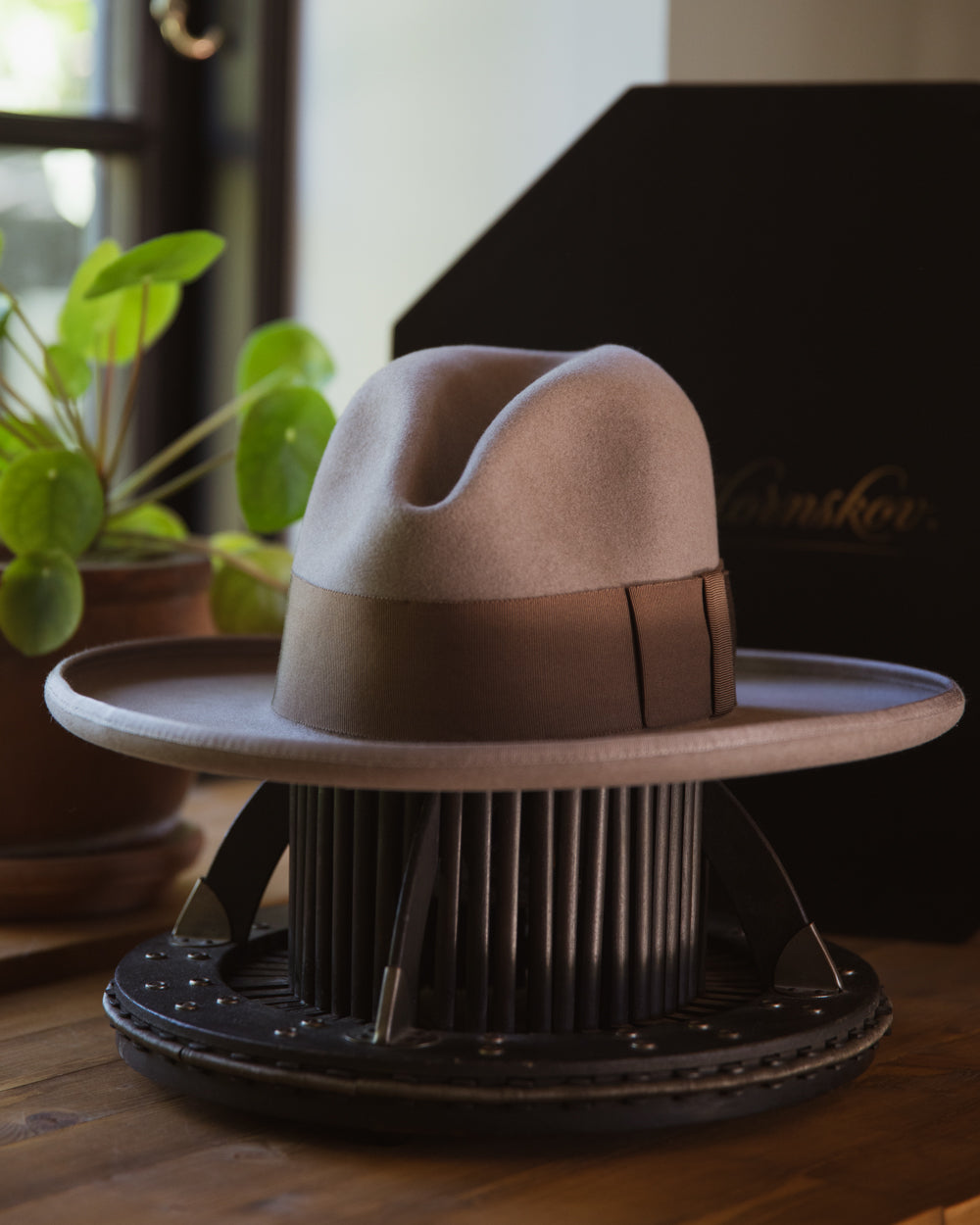 This hat is made from the best materials available. The felt used for this hat is what we call western weight. It has a sturdy, rigid brim and a smooth, pliable crown. It comes in a 50X beaver/hare blend and a pure 100X beaver fur felt.