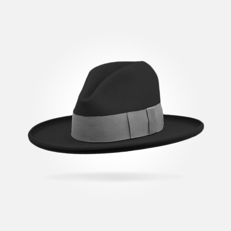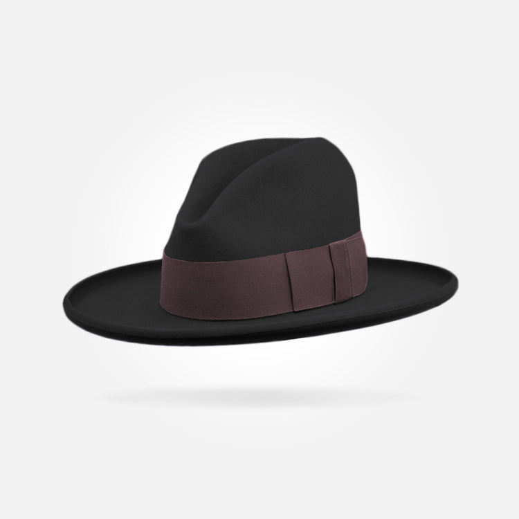 It features a 50 mm modern grosgrain hatband with a double back box bow.
