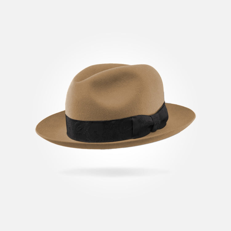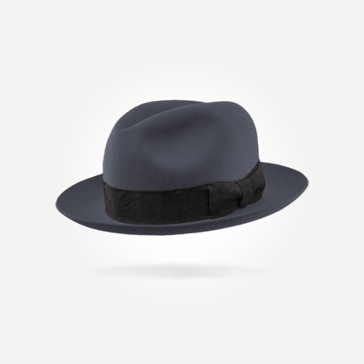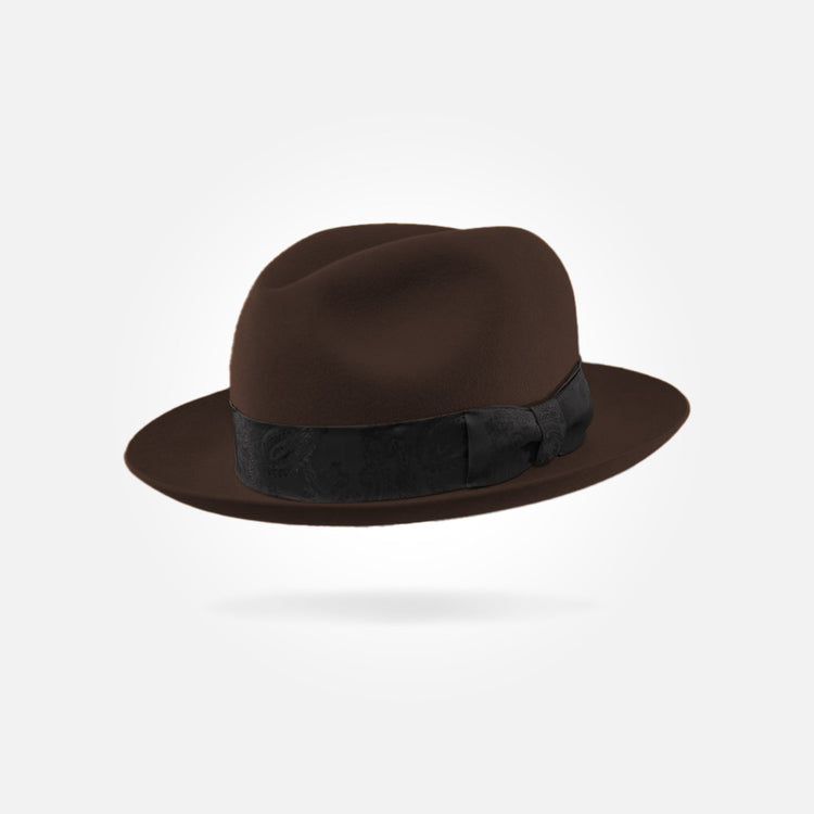 This is a medium height classic centre dent fedora with a 6.5 cm / 2.55 in snap brim.It features a 38 mm paisley hatband with a classic back bow.