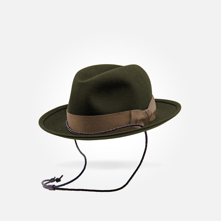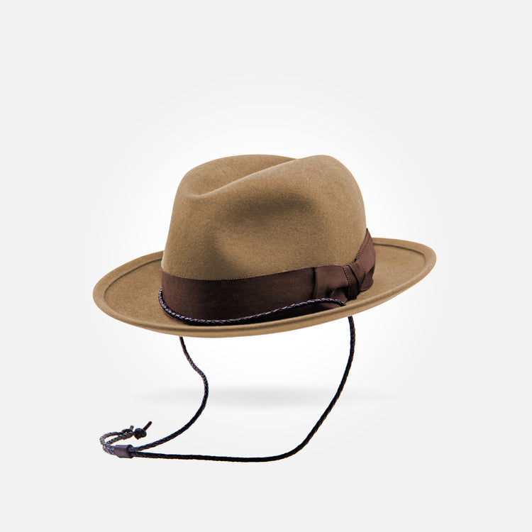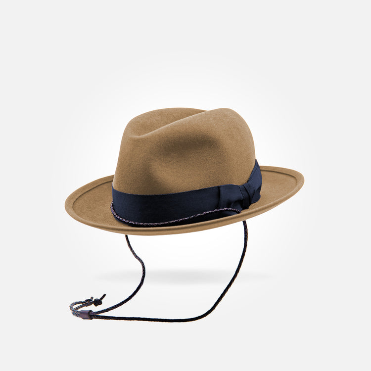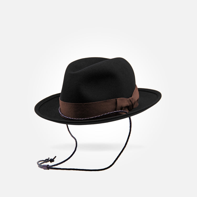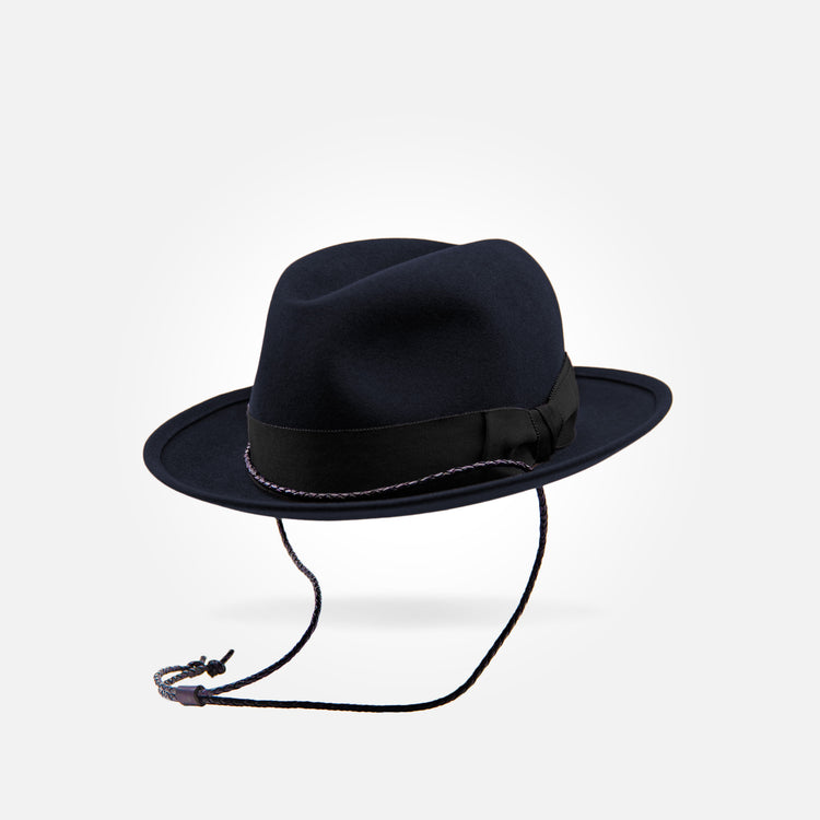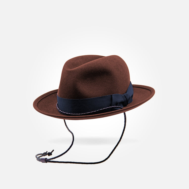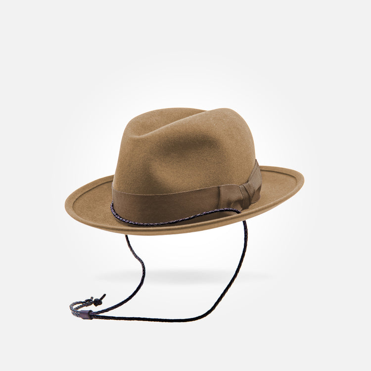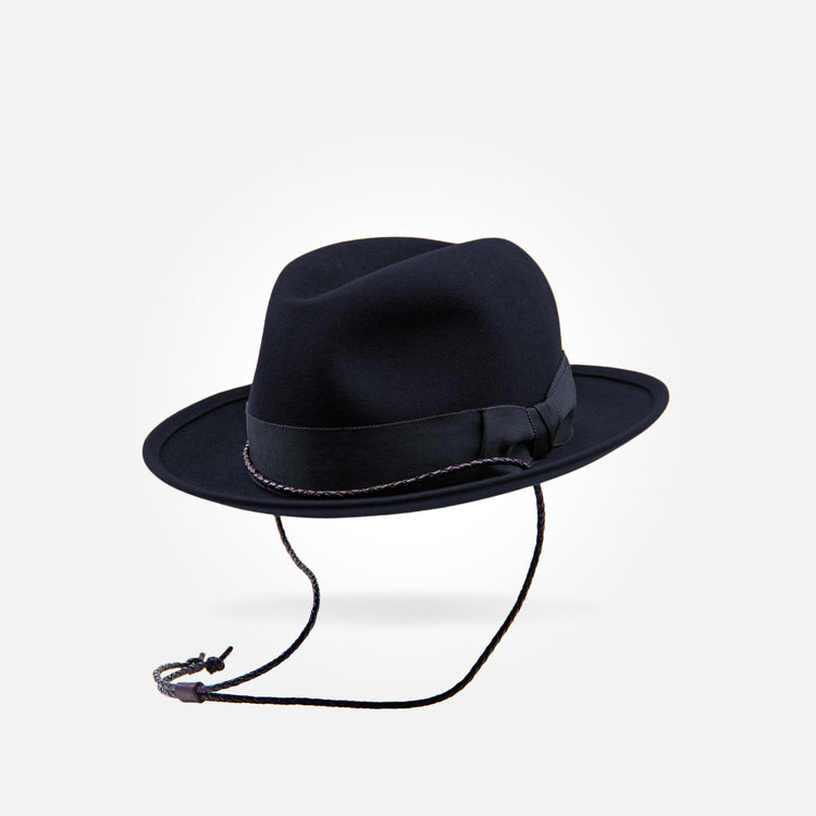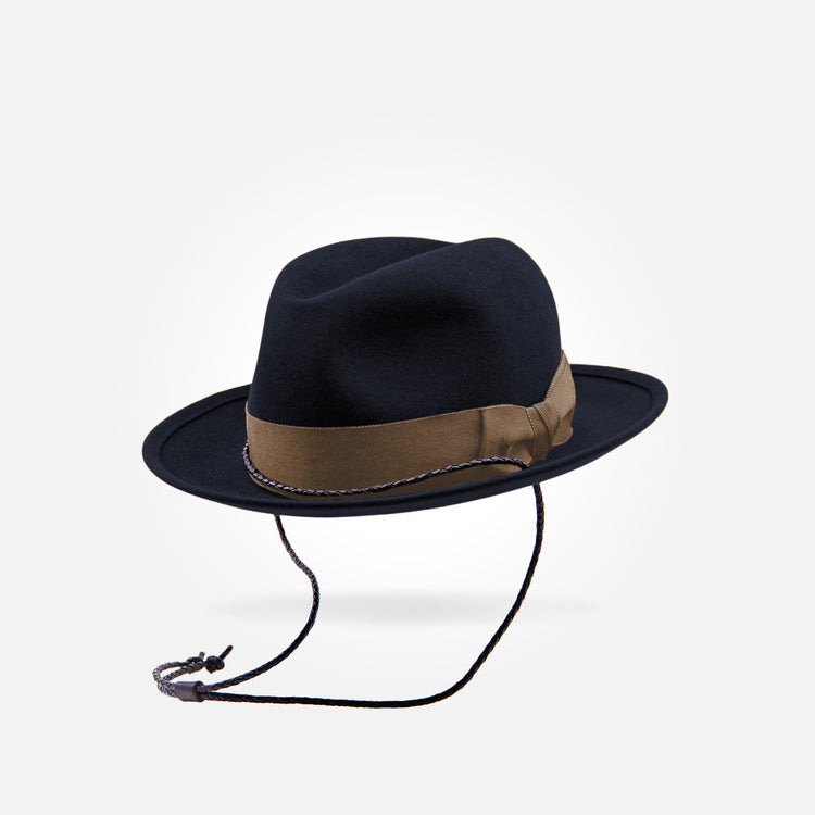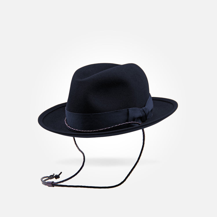 This is a medium height classic centre dent fedora with a 6 cm / 2.36 in overwelt brim. It features a 38 mm modern grosgrain hatband & a stamped string.