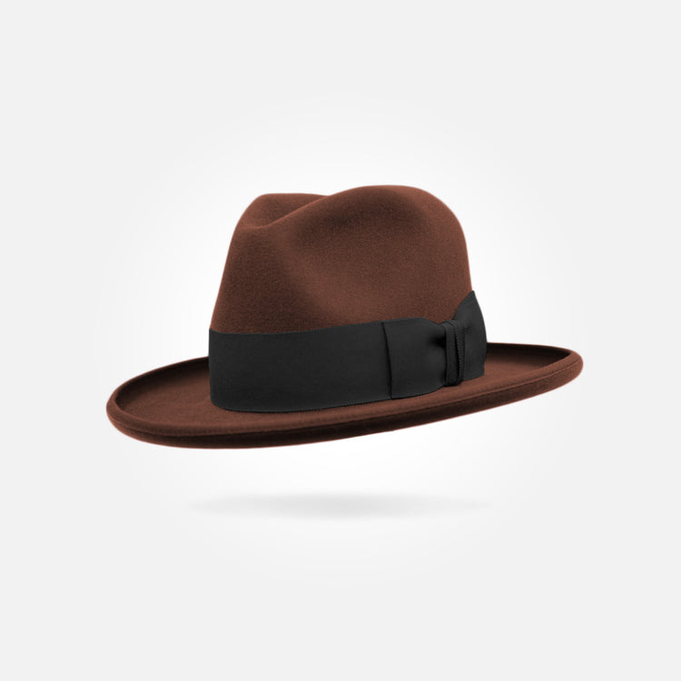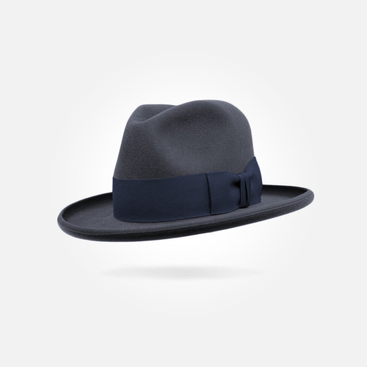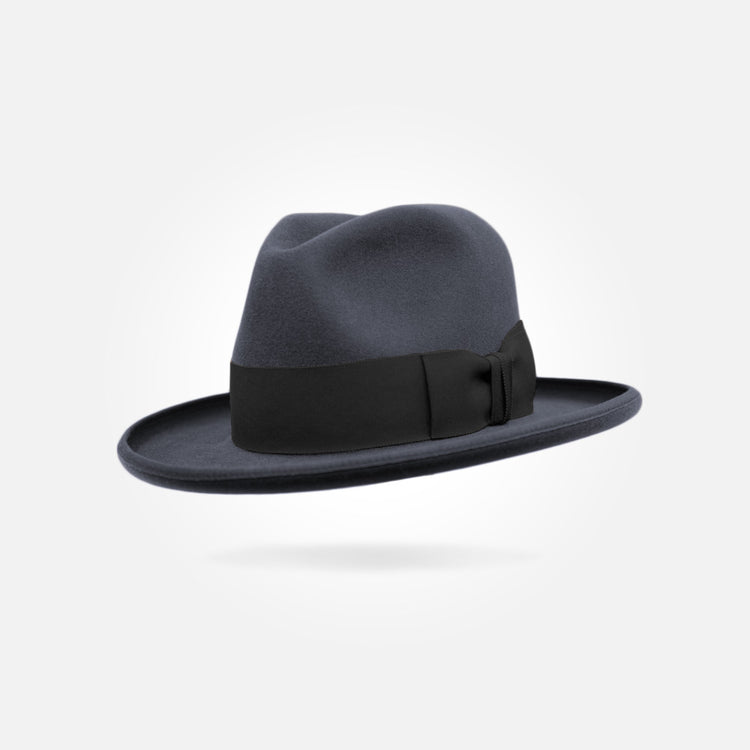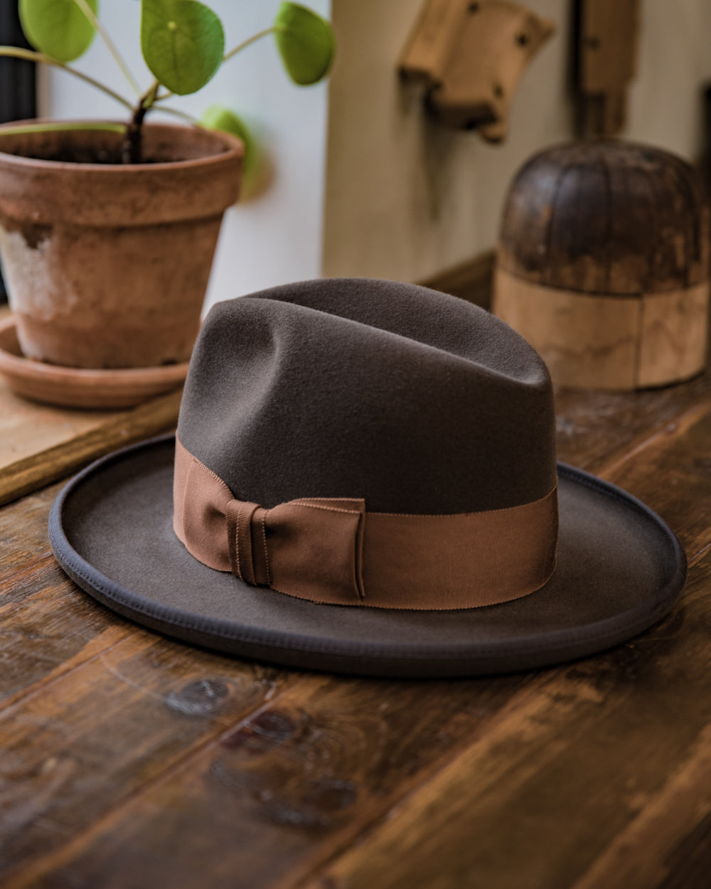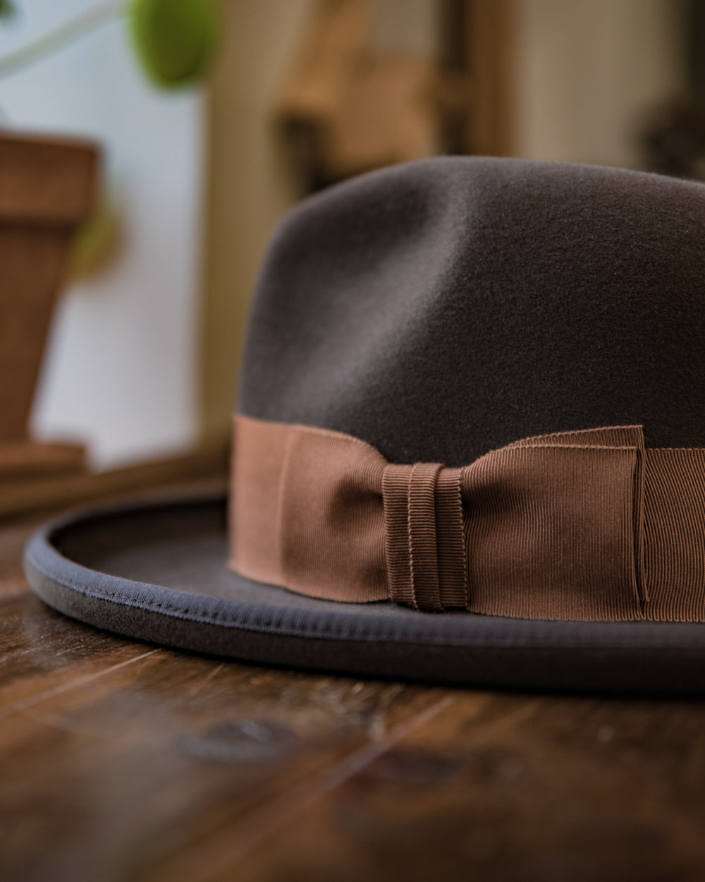 This is a medium height classic centre dent fedora with a 7 cm / 2.75 in bound pencil roll brim. It features a 50 mm modern grosgrain hatband with a classic double back bow.