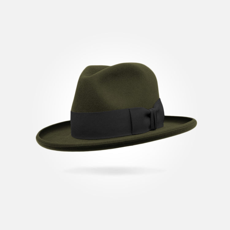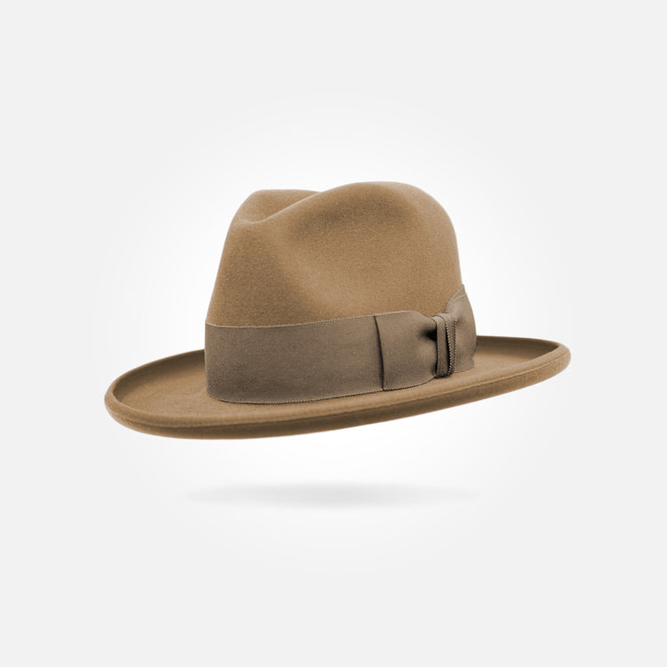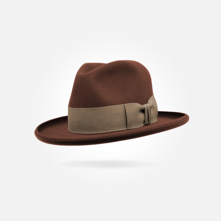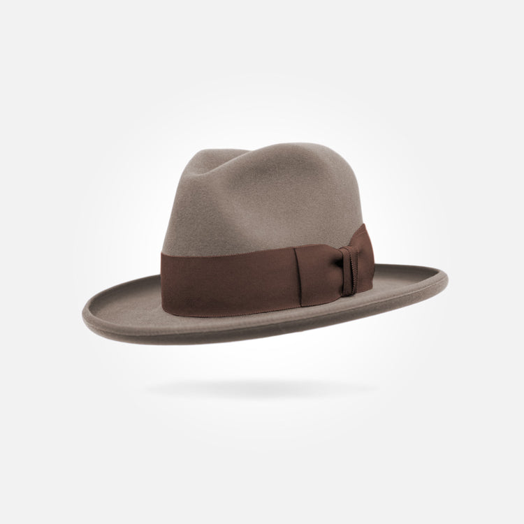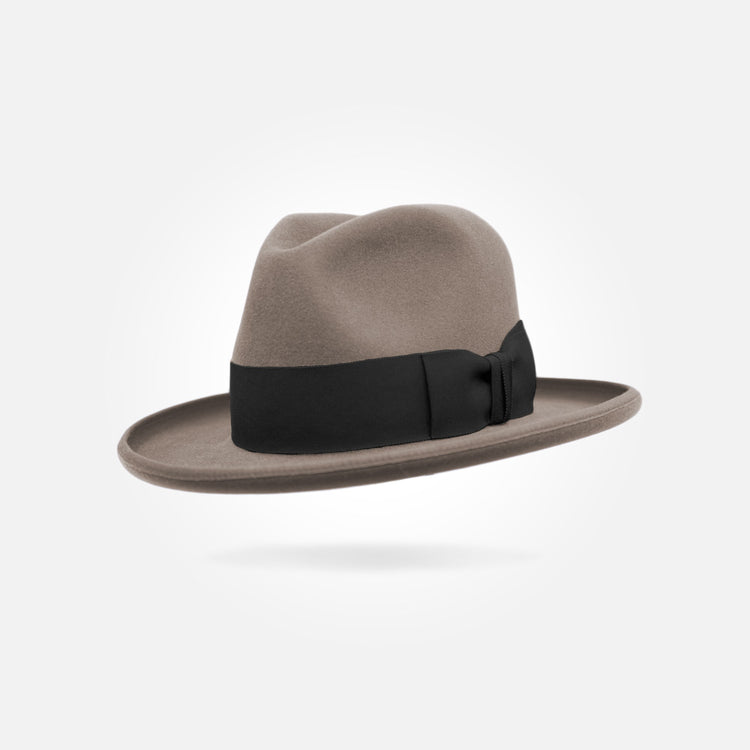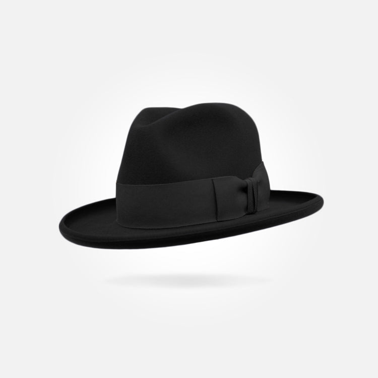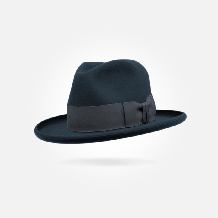 This is a medium height classic centre dent fedora with a 7 cm / 2.75 in bound pencil roll brim. It features a 50 mm modern grosgrain hatband with a classic double back bow.